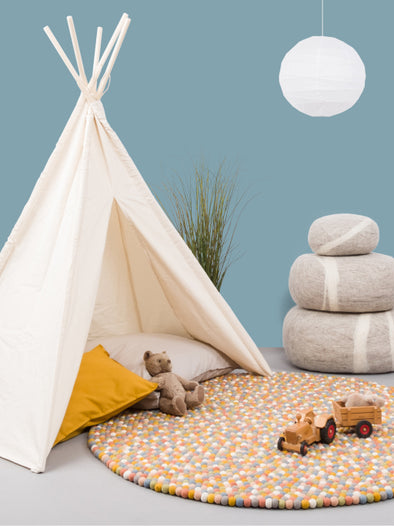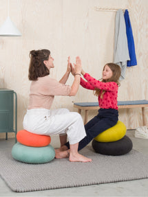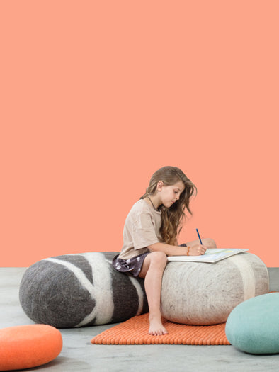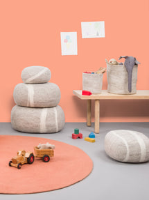 Elk kind is uniek en daarom zijn onze vilten steentjes en de kleurrijke, speelse Colour Poufs unieke stukken die met de hand zijn gemaakt. Ze verfraaien de kinderkamer zichtbaar als natuurlijk designelement, als accessoire in combinatie met de verschillende myfelt vilten Tapijten of als zacht zit- en speelelement. Twee op elkaar gestapelde poefs bieden ook voor volwassenen een praktische zithoogte.