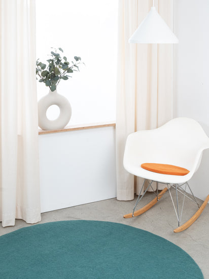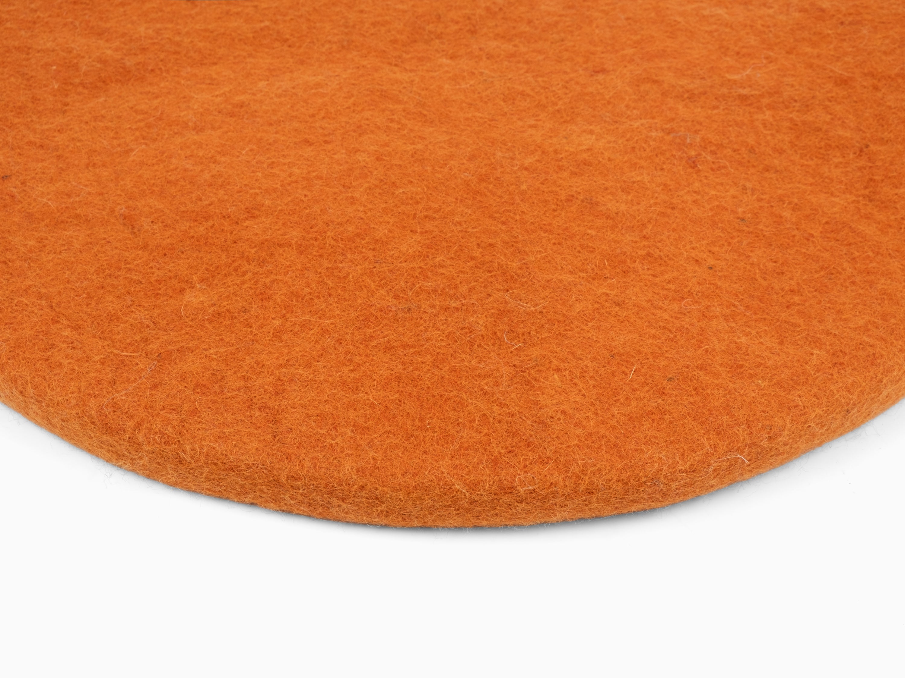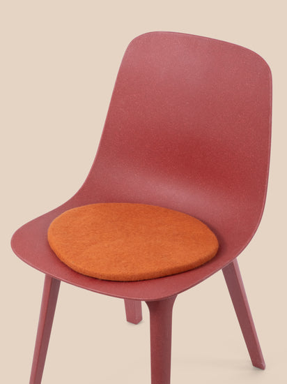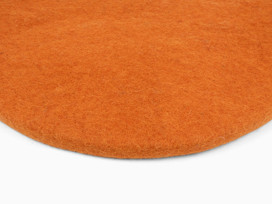 Runde, orangefarbene flache Sitzauflage aus reiner Schurwolle.
