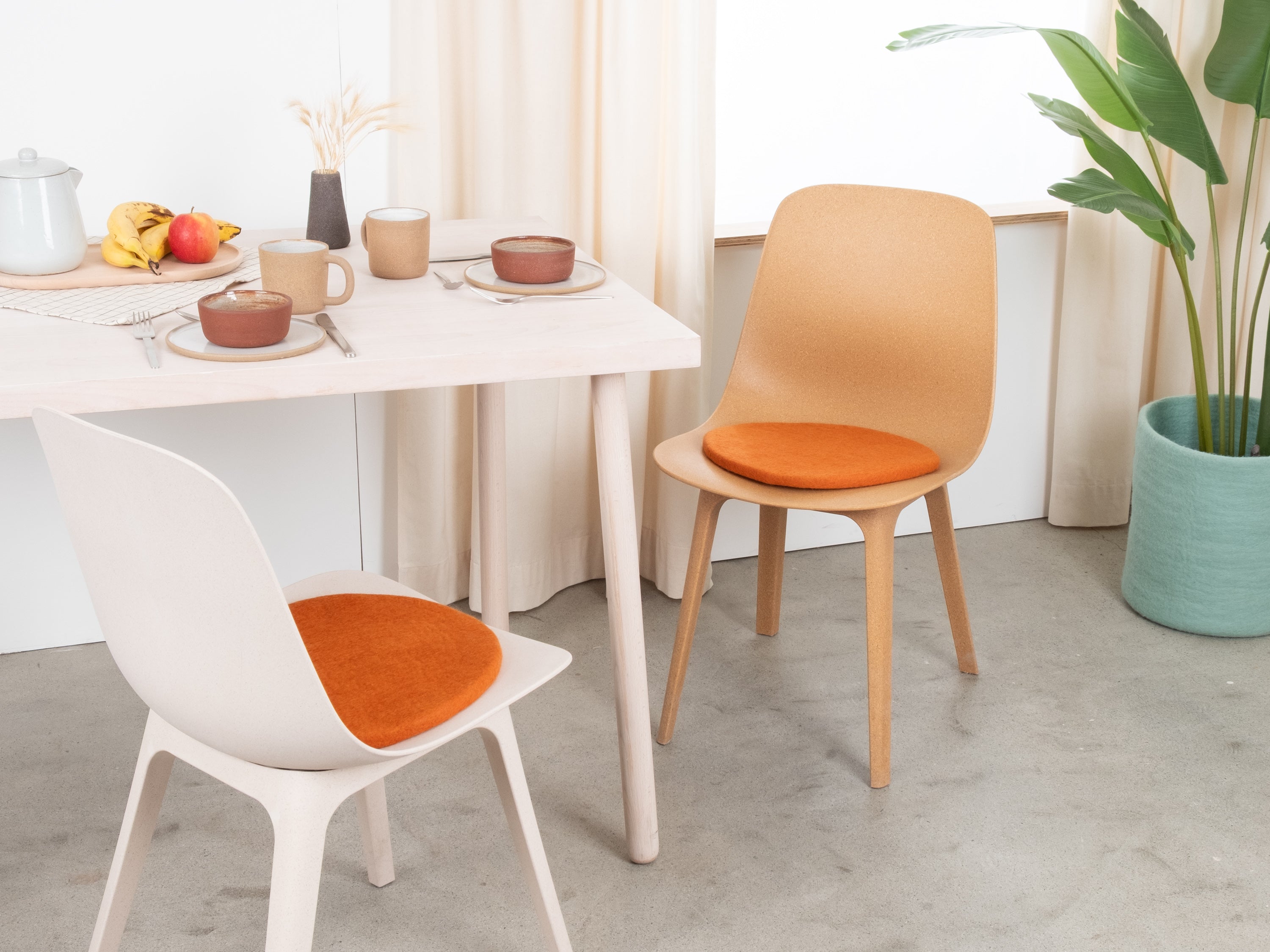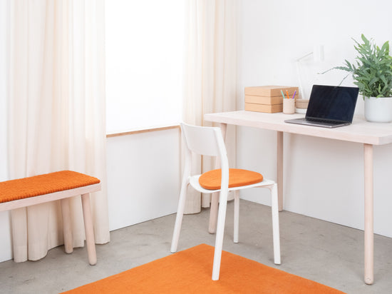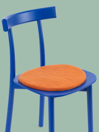 Die orangefarbene, flache Sitzauflage Afra bringt Wärme und Weichheit auf deinen Lieblingsstuhl. Gefertigt aus reiner Schurwolle, von Hand in Nepal hergestellt und unter fairen Bedingungen produziert. myfelt Sitzauflagen sind wasser- und schmutzabweisend und beidseitig verwendbar.