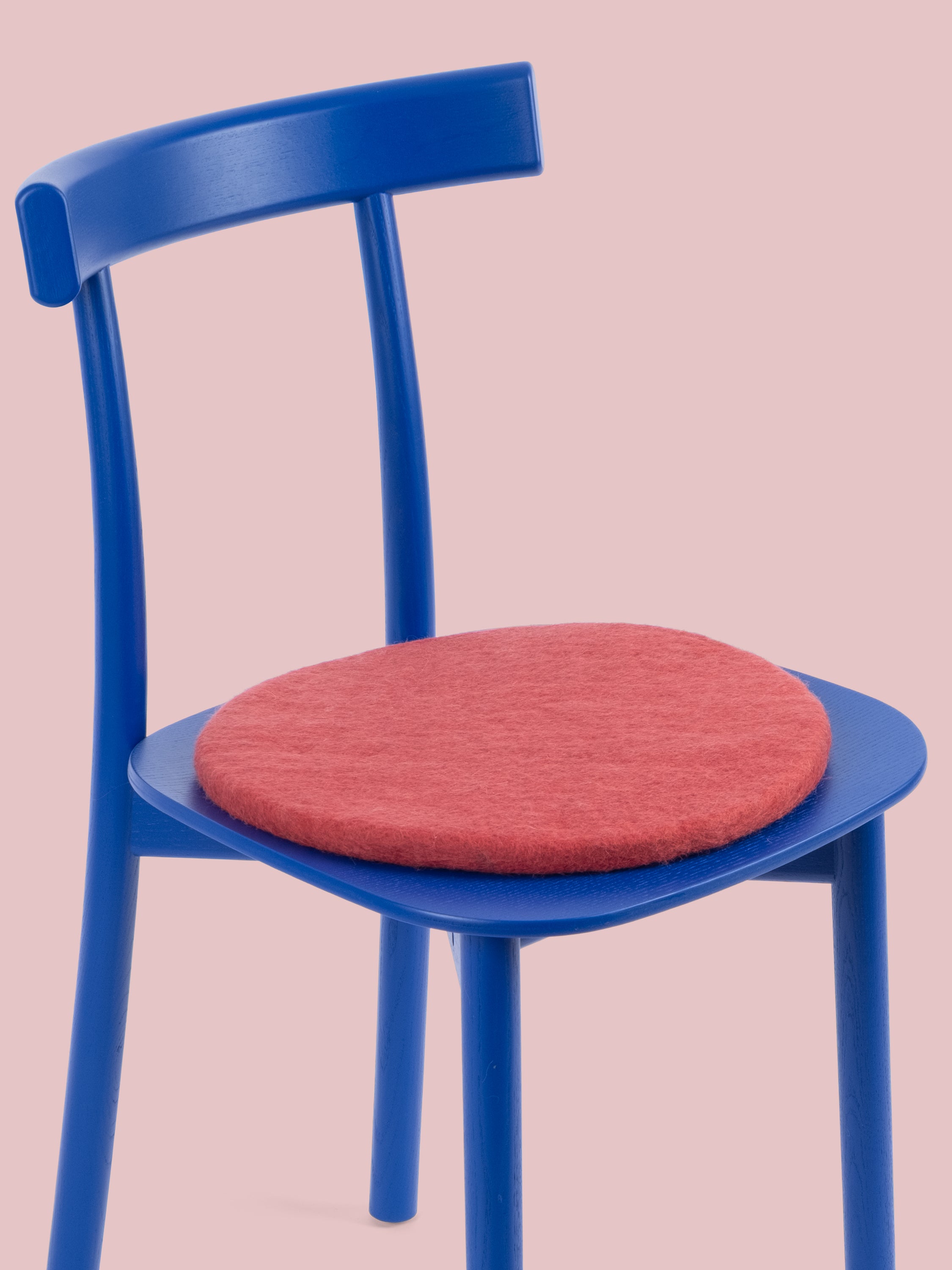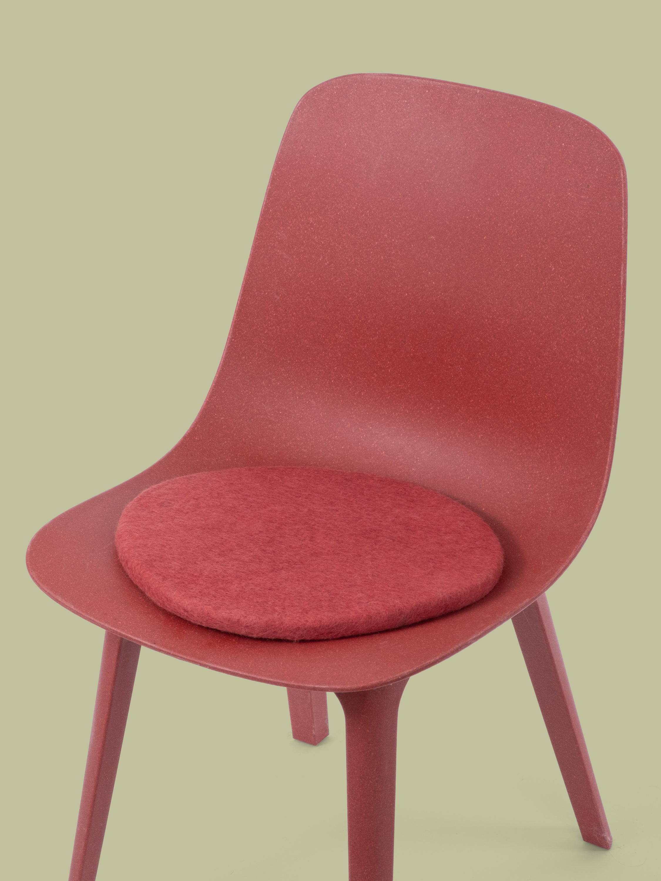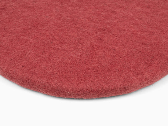Runde, weinrote flache Sitzauflage aus reiner Schurwolle.
