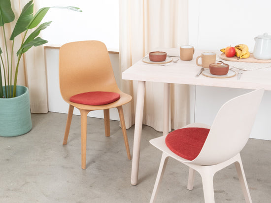 Die weinrote, flache Sitzauflage Kaja bringt Wärme und Weichheit auf deinen Lieblingsstuhl. Gefertigt aus reiner Schurwolle, von Hand in Nepal hergestellt und unter fairen Bedingungen produziert. myfelt Sitzauflagen sind wasser- und schmutzabweisend und beidseitig verwendbar.