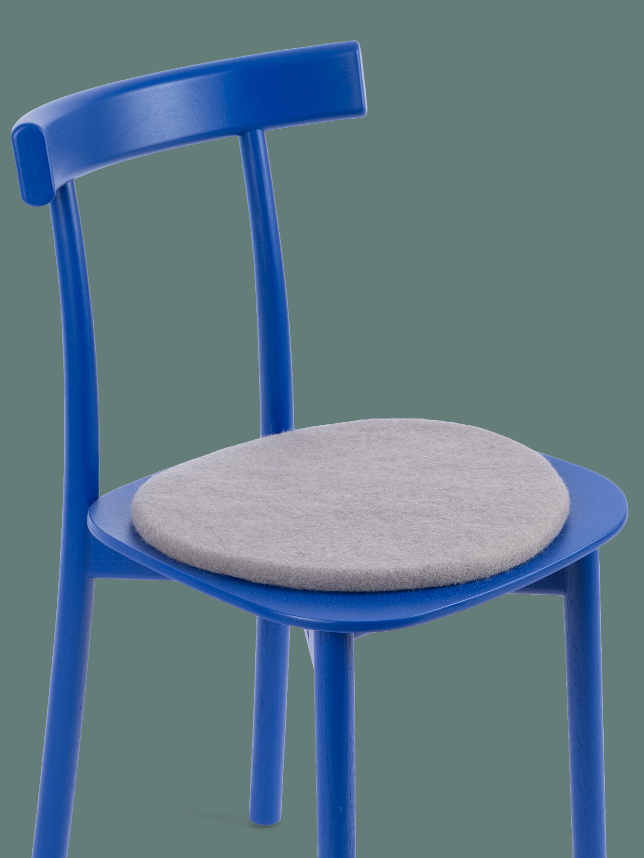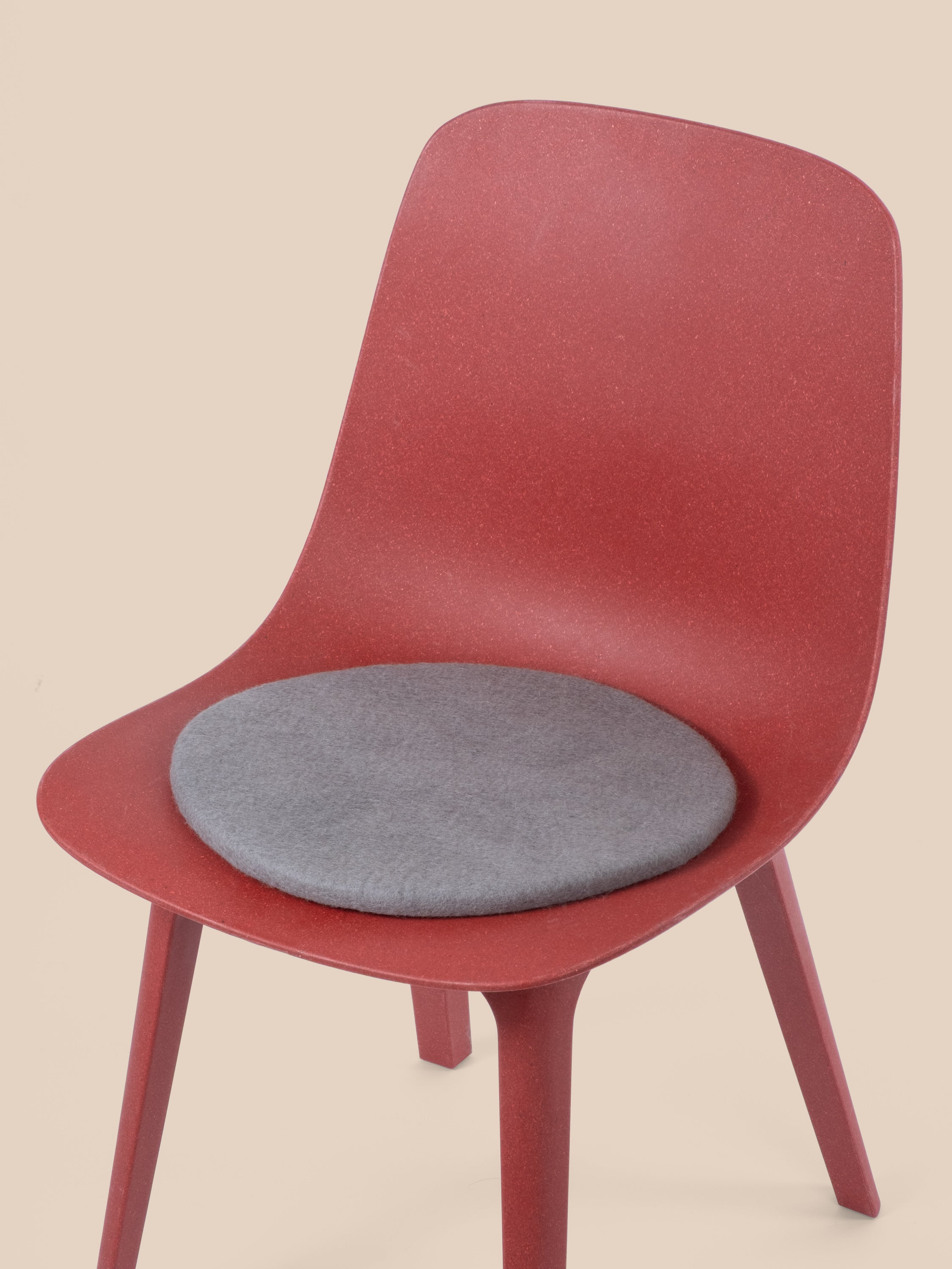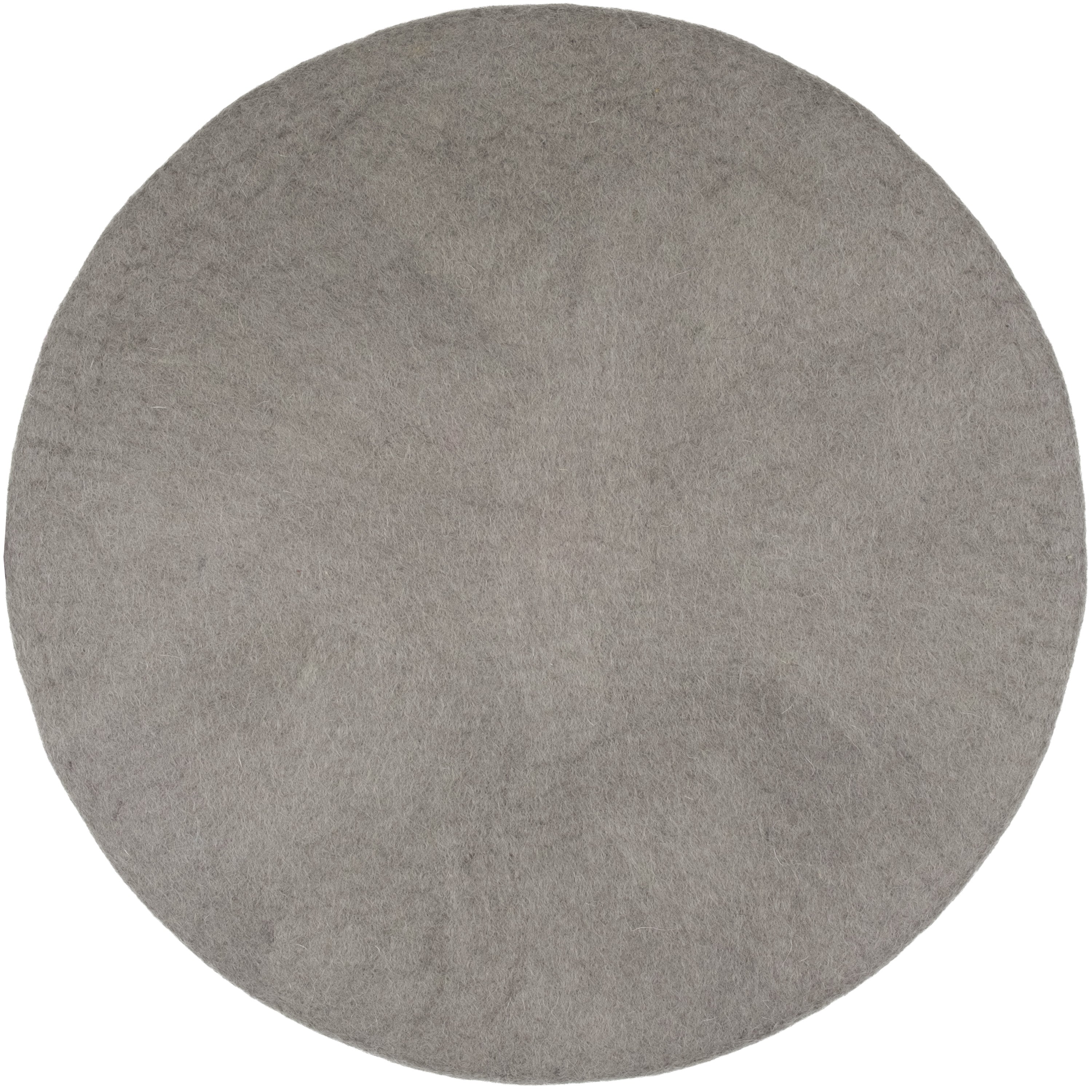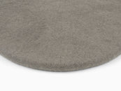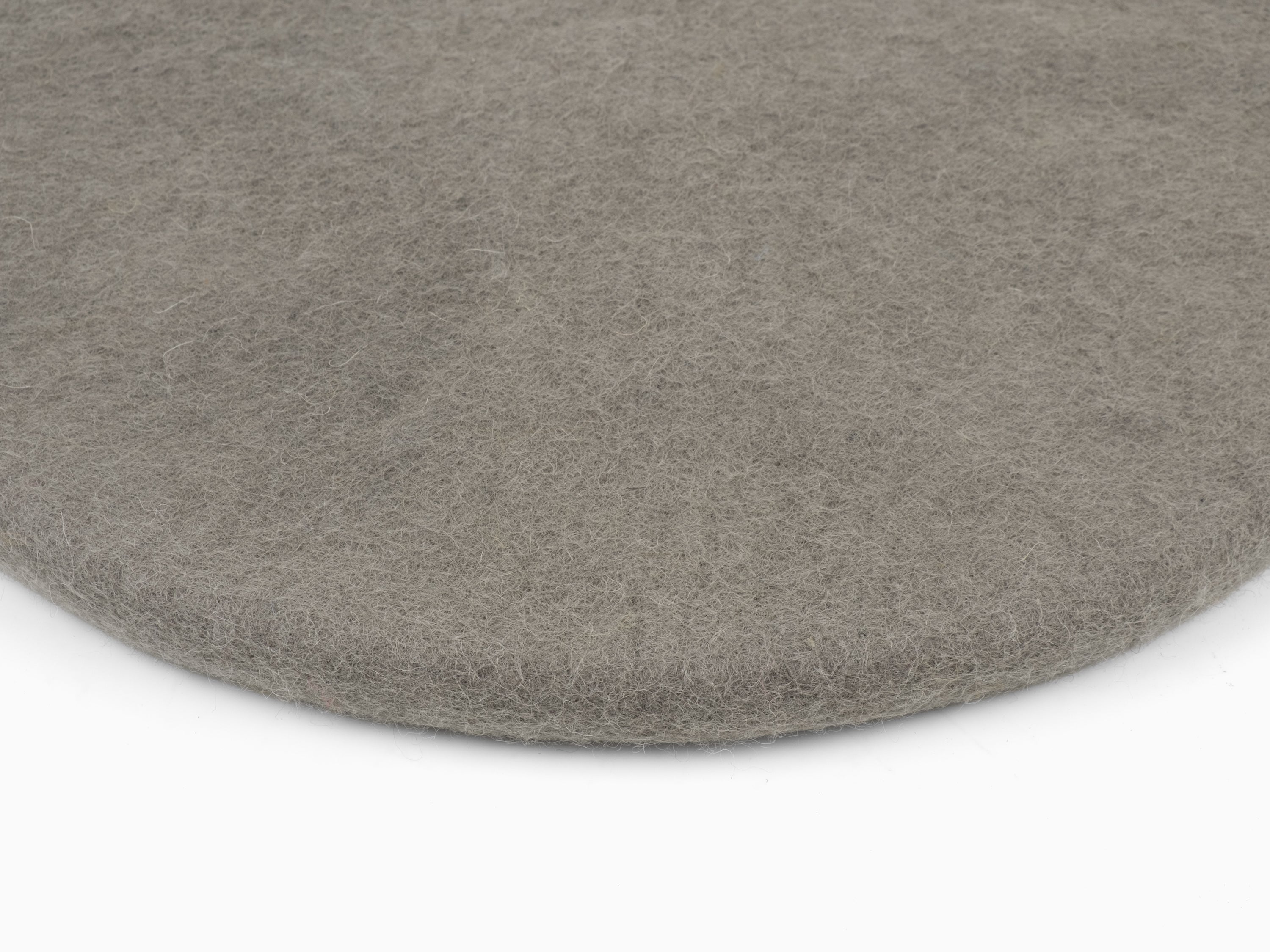 Runde, graue flache Sitzauflage aus reiner Schurwolle.