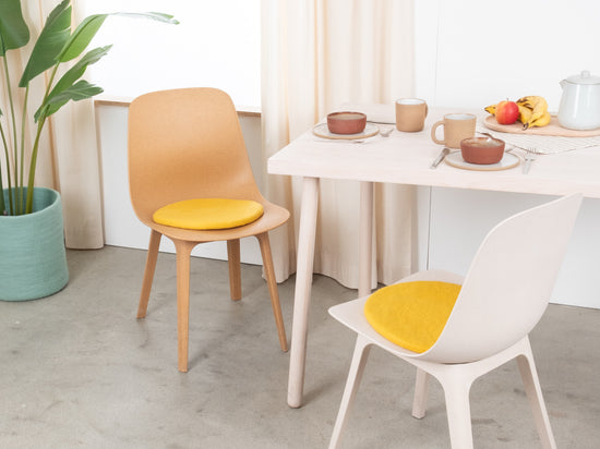 Die gelbe, flache Sitzauflage Kira bringt Wärme und Weichheit auf deinen Lieblingsstuhl. Gefertigt aus reiner Schurwolle, von Hand in Nepal hergestellt und unter fairen Bedingungen produziert. myfelt Sitzauflagen sind wasser- und schmutzabweisend und beidseitig verwendbar.