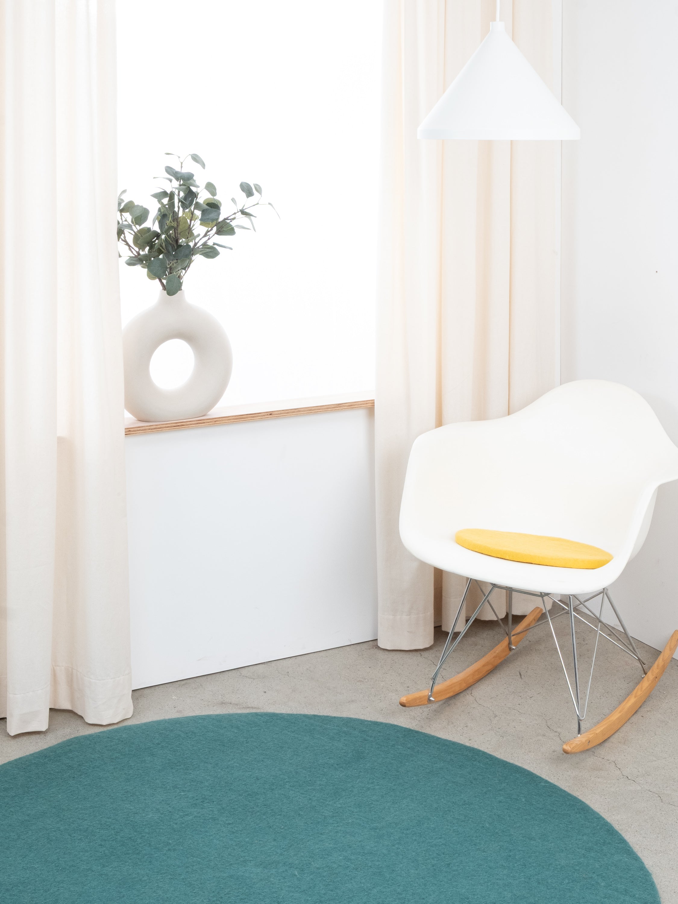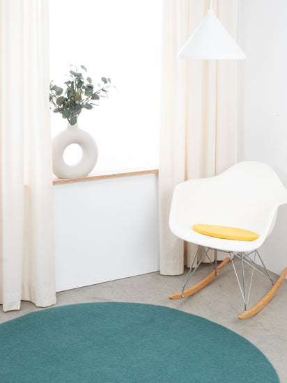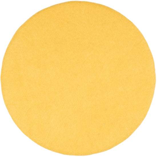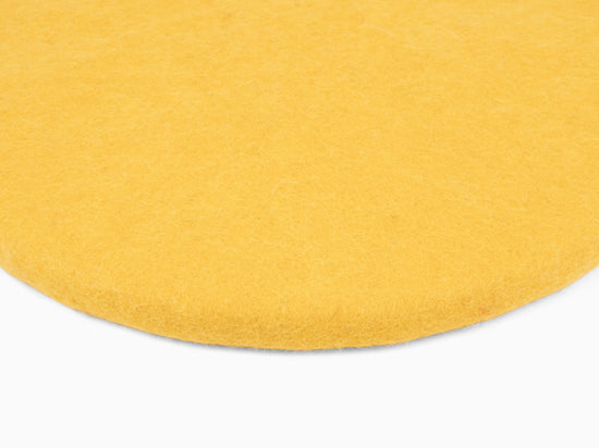 Runde, gelbe flache Sitzauflage aus reiner Schurwolle.