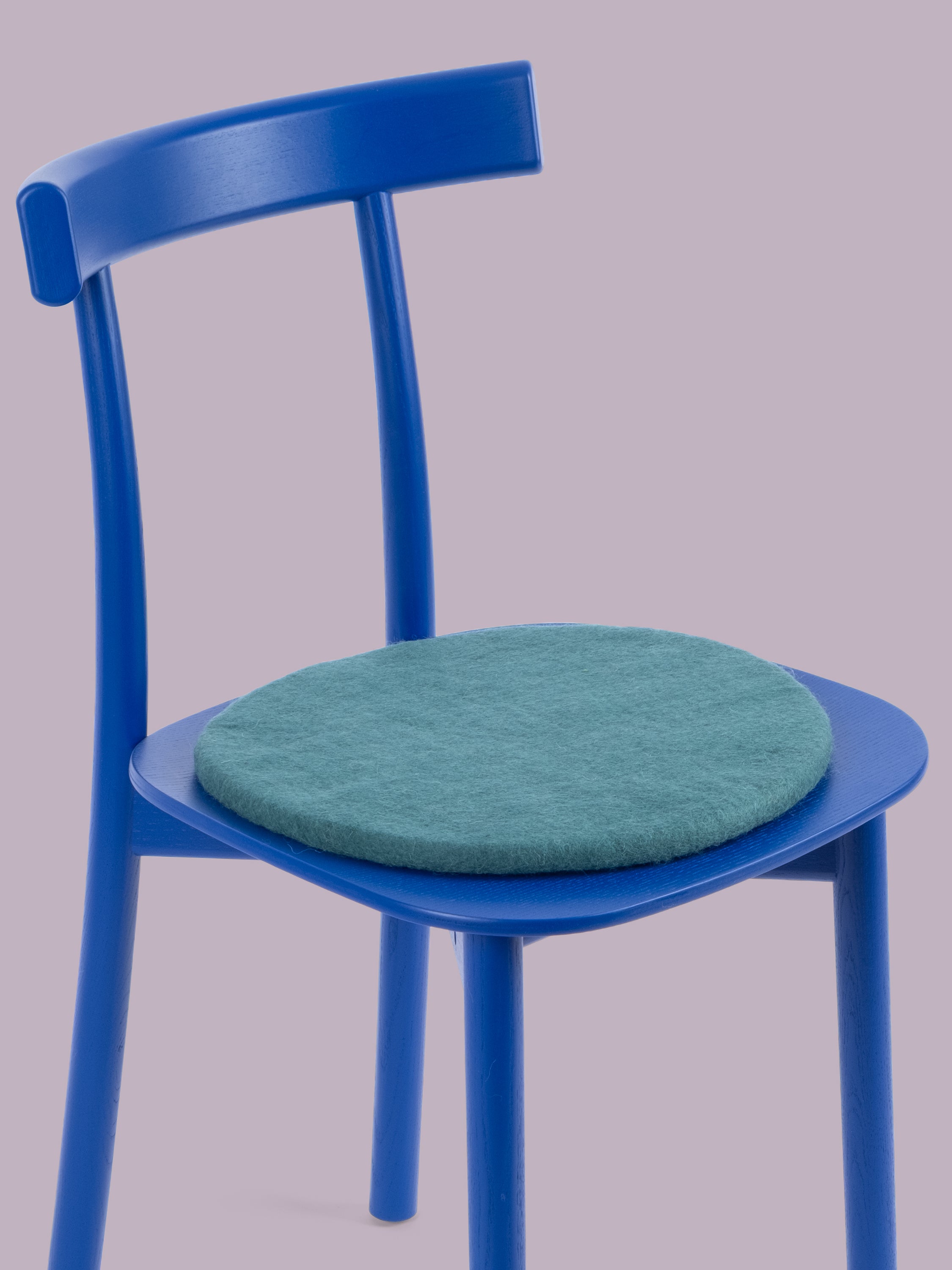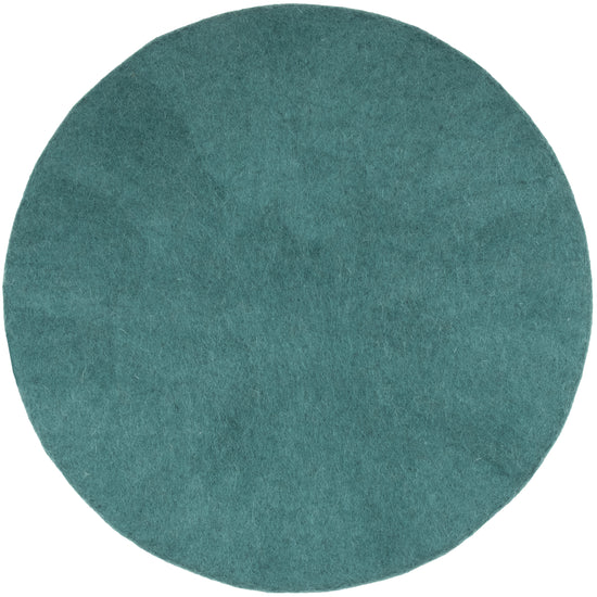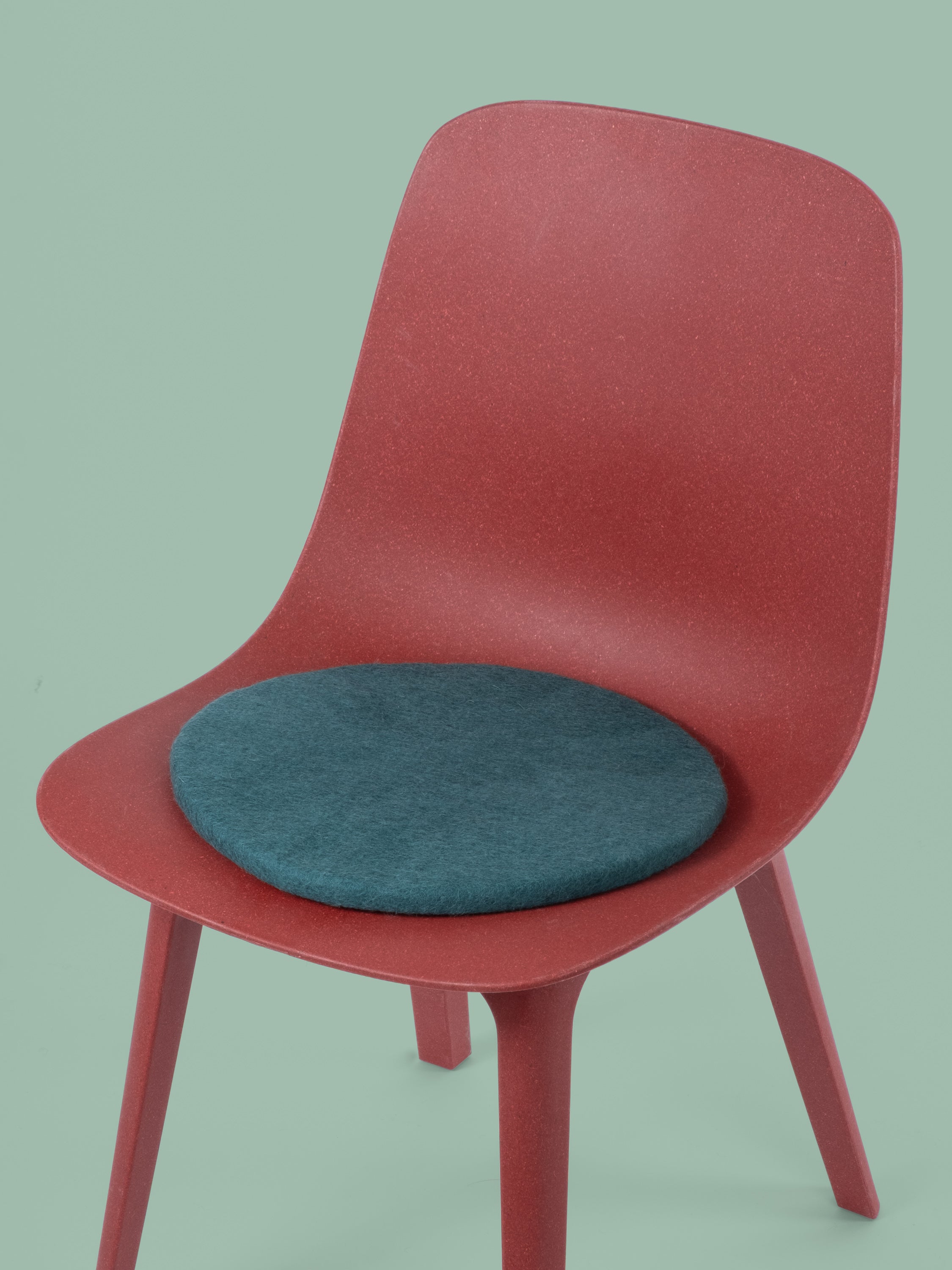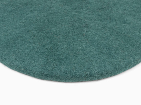 Runde, petrolfarbene flache Sitzauflage aus reiner Schurwolle.