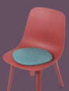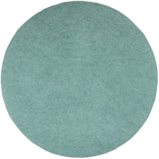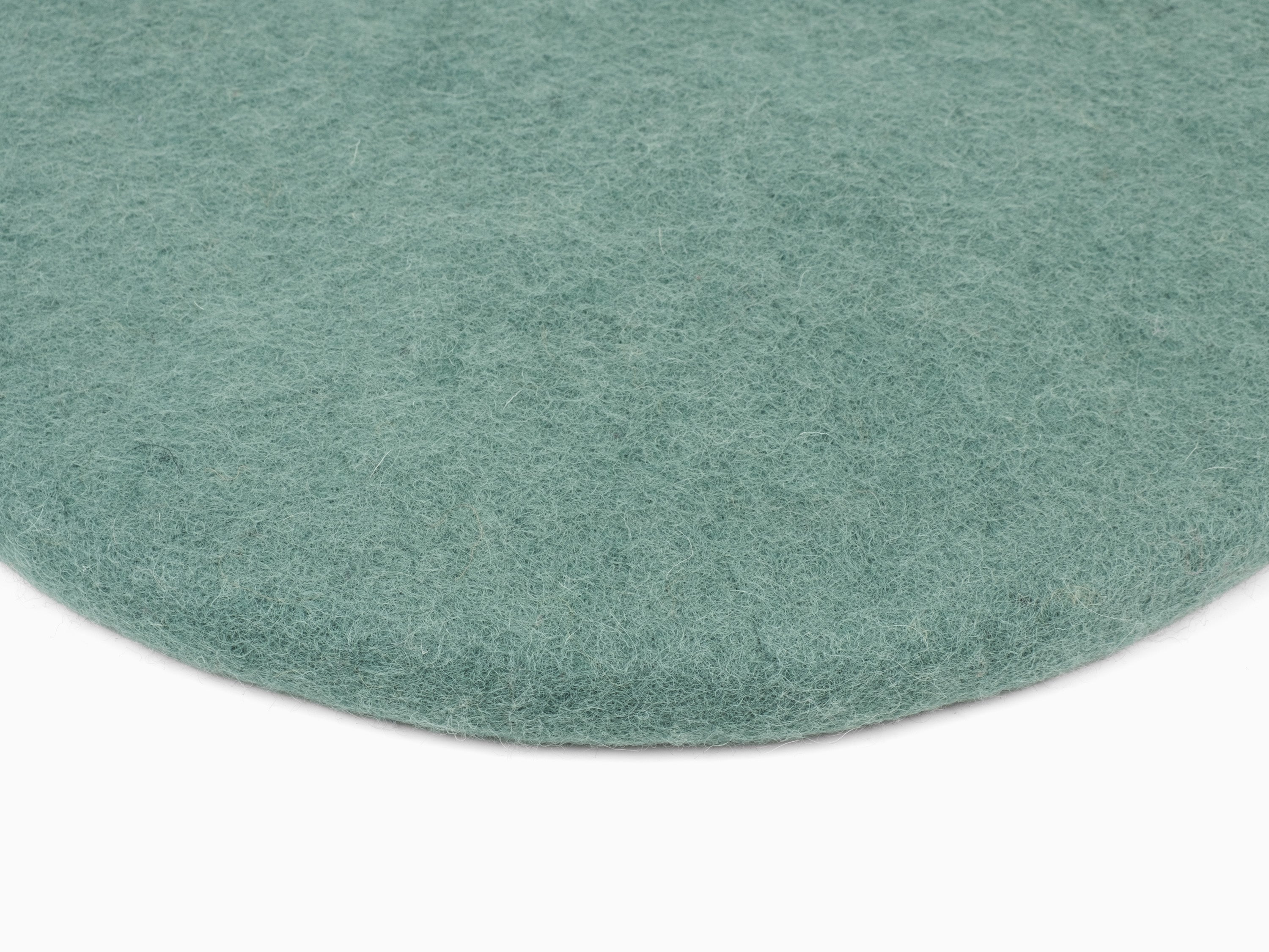 Runde, aquafarbene flache Sitzauflage aus reiner Schurwolle.