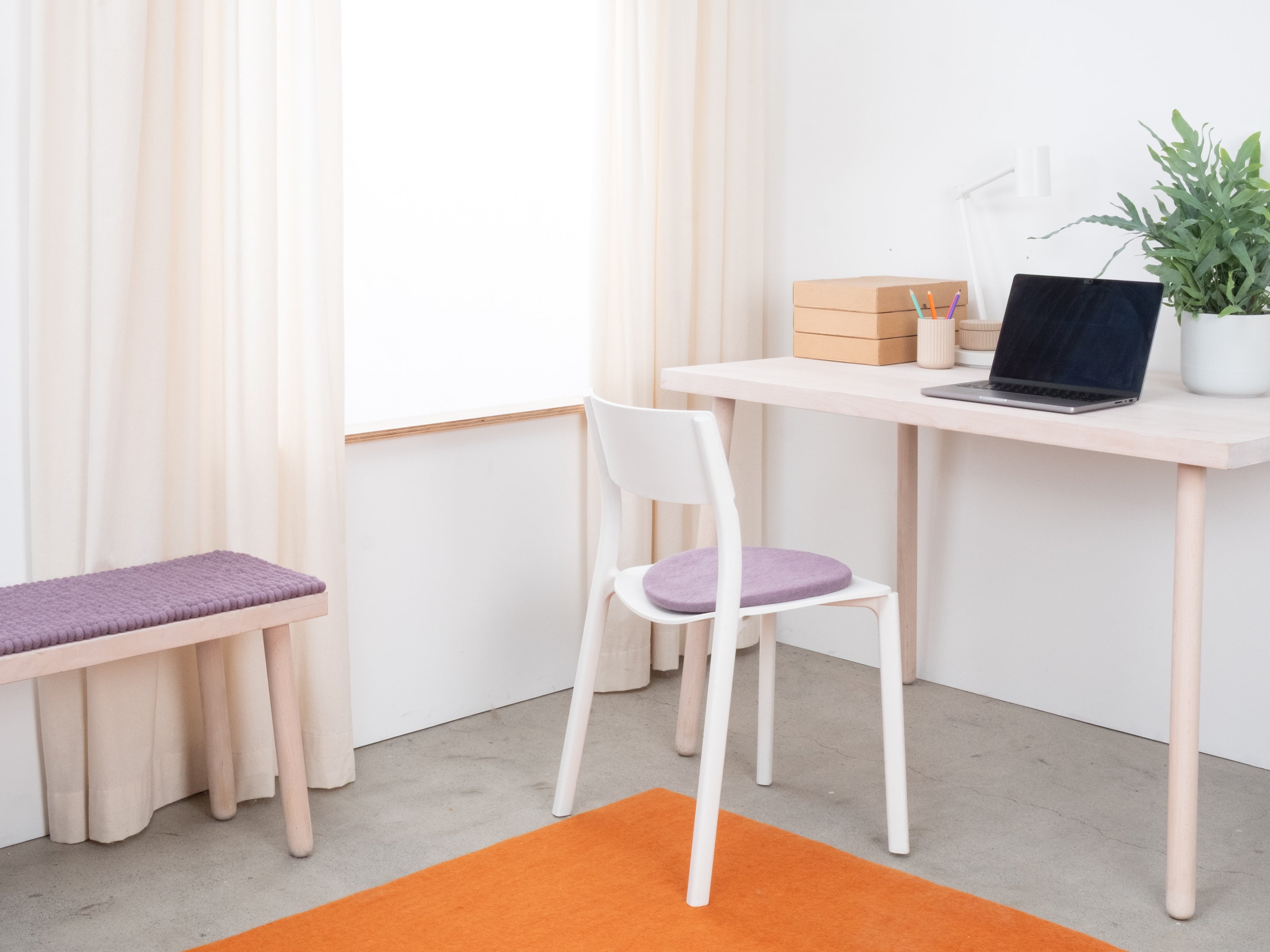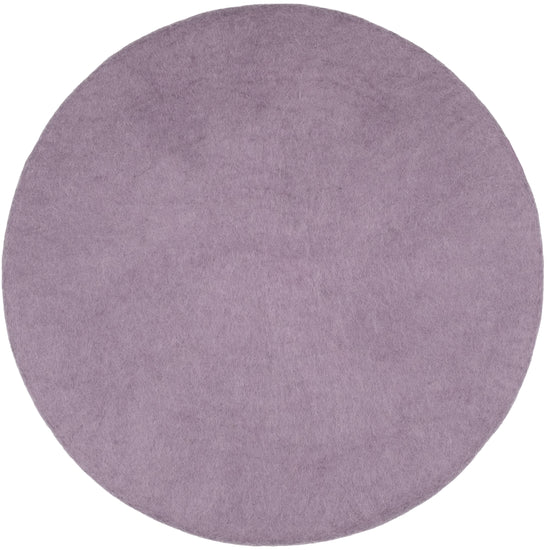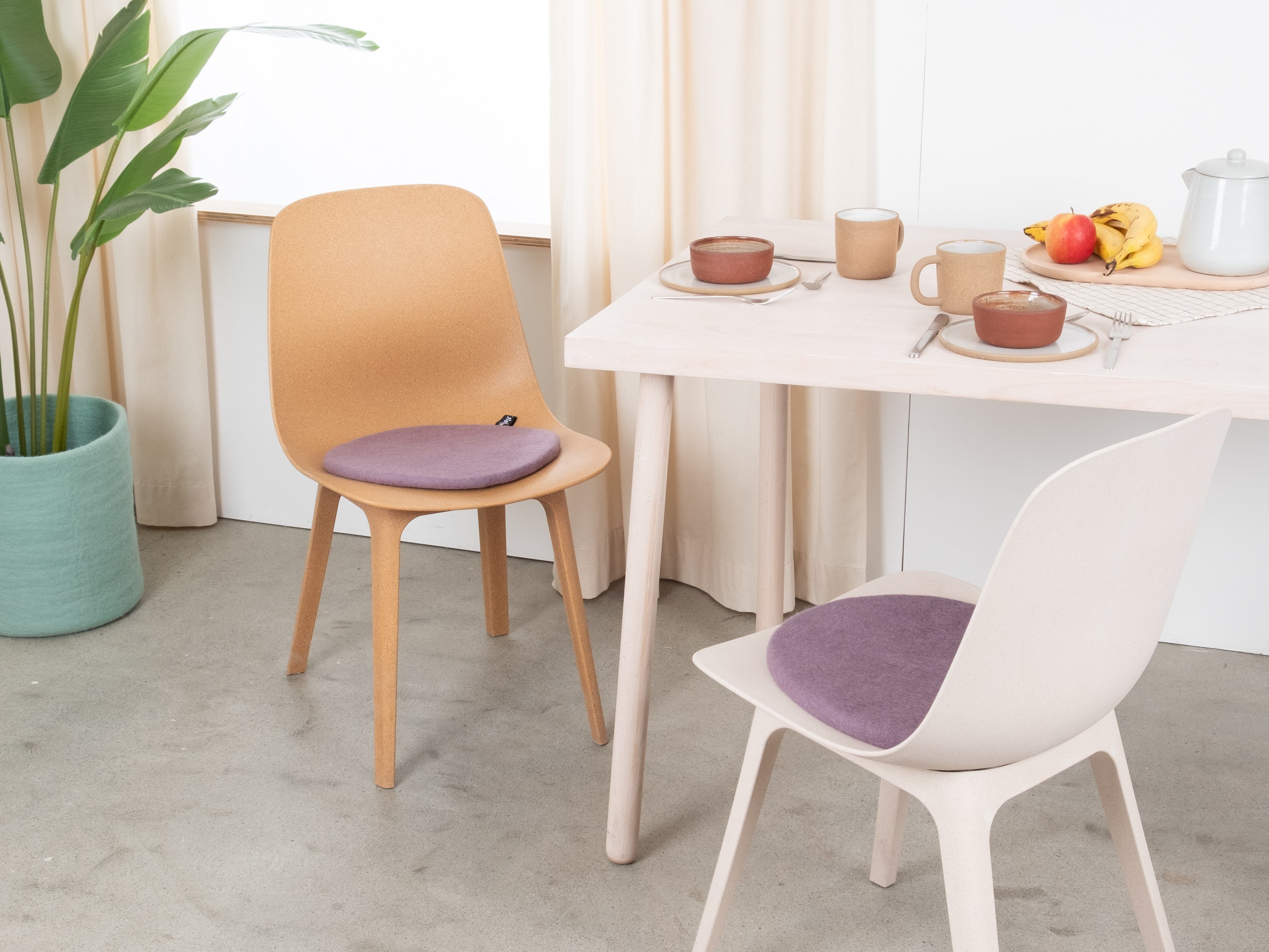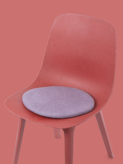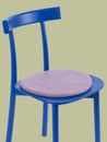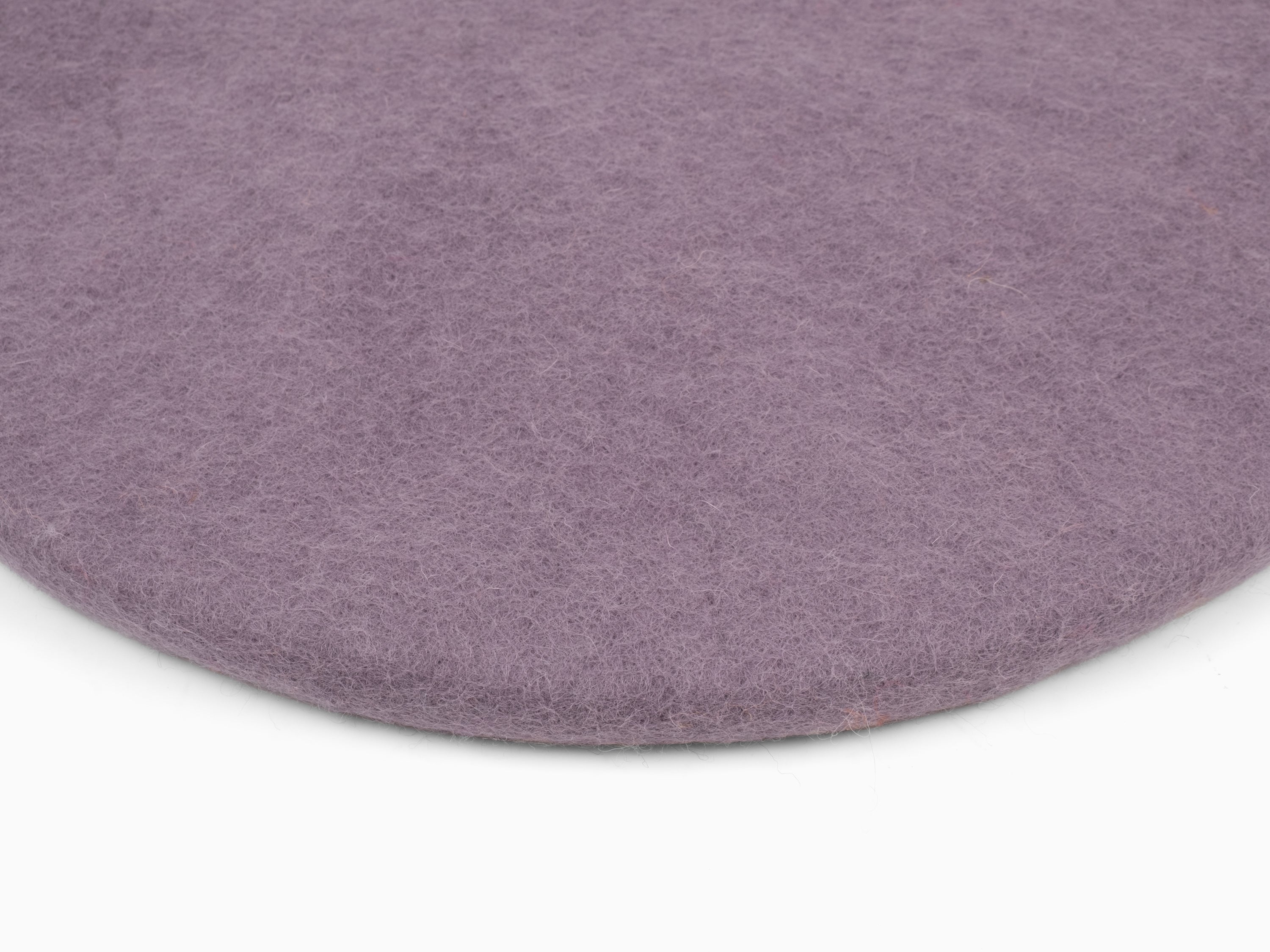 Runde, fliedergraue flache Sitzauflage aus reiner Schurwolle.