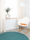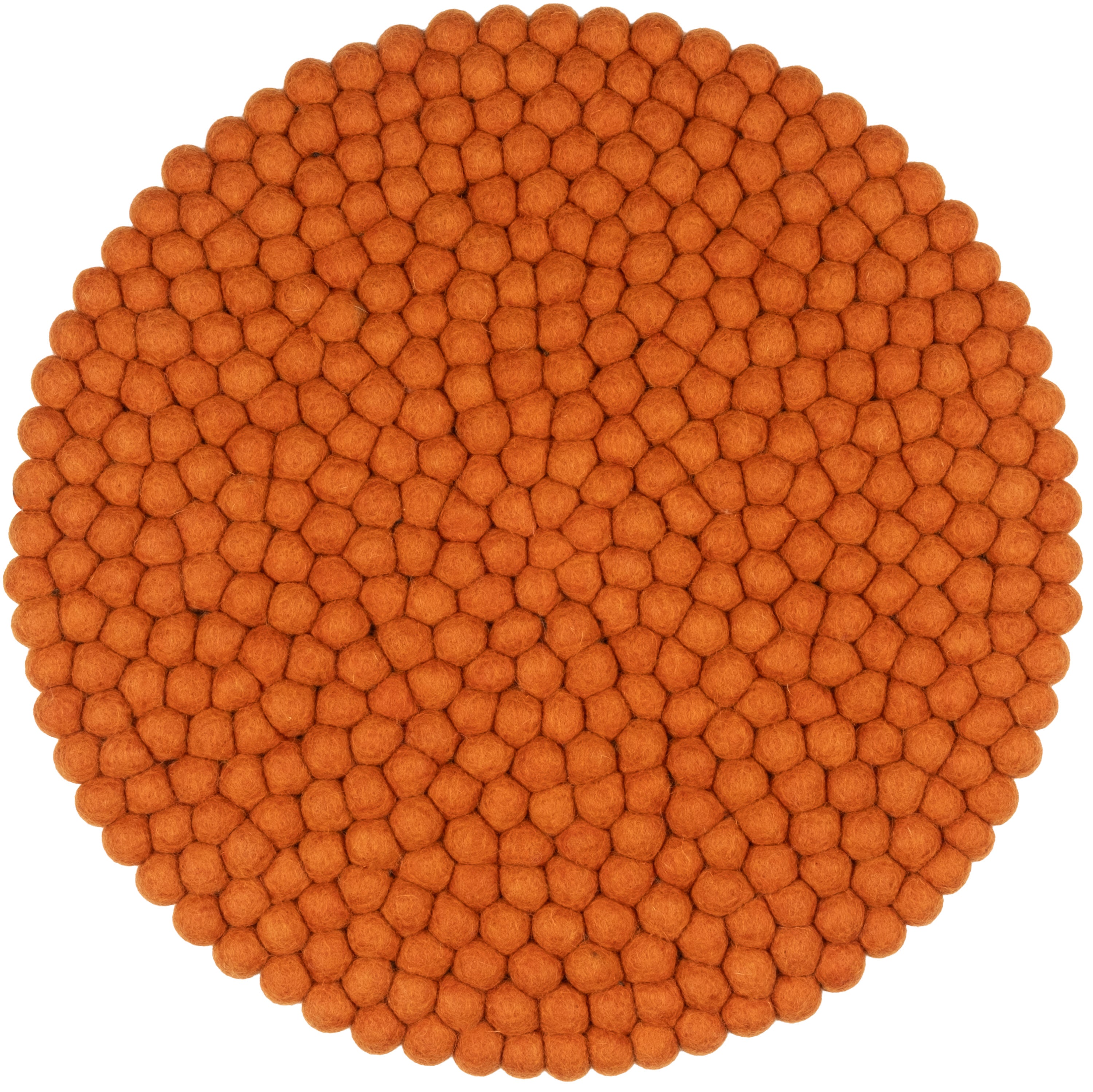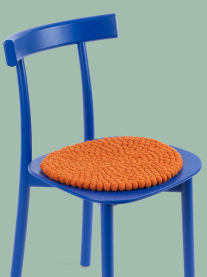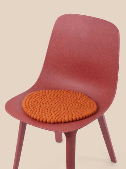 Runde, orangefarbene Sitzauflage aus reiner Schurwolle.