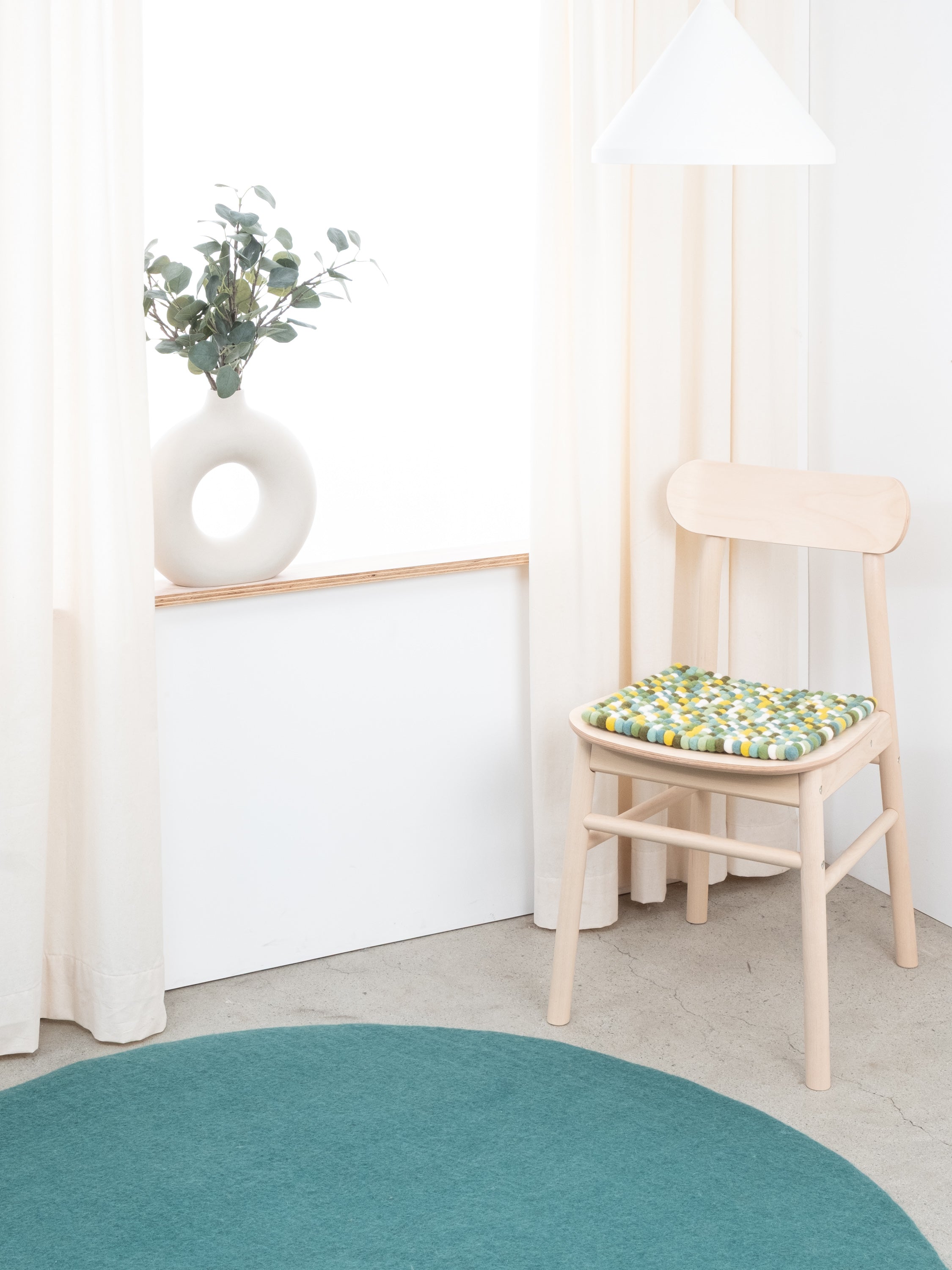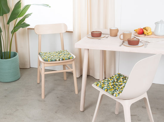 Die multifarbene Sitzauflage Finn bringt Wärme und Weichheit auf deinen Lieblingsstuhl. Gefertigt aus reiner Schurwolle, von Hand in Nepal hergestellt und unter fairen Bedingungen produziert. myfelt Sitzauflagen sind wasser- und schmutzabweisend und beidseitig verwendbar.