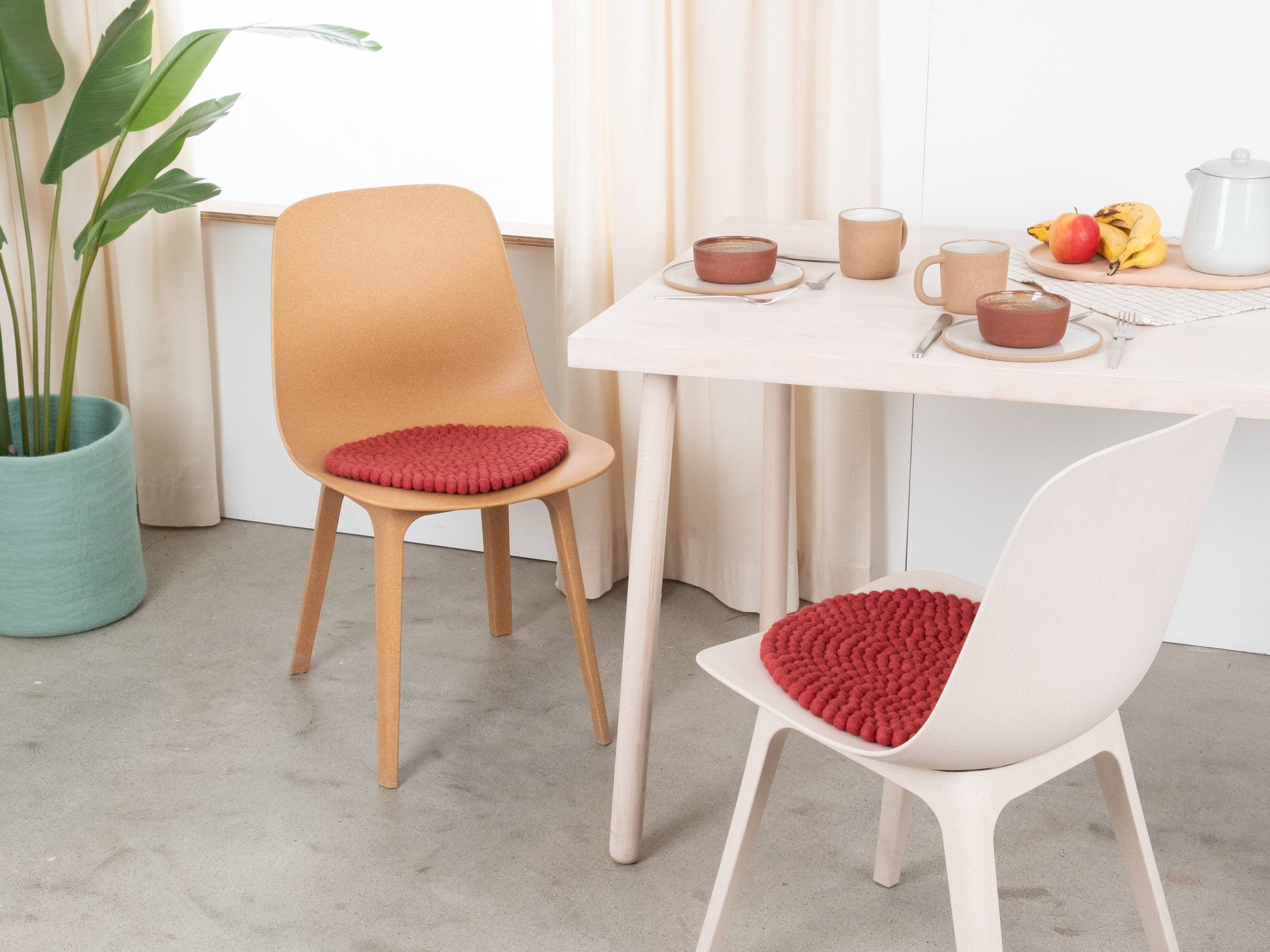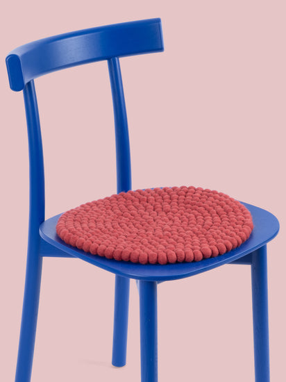 Runde, weinrote Sitzauflage aus reiner Schurwolle.