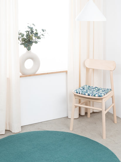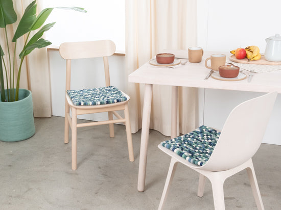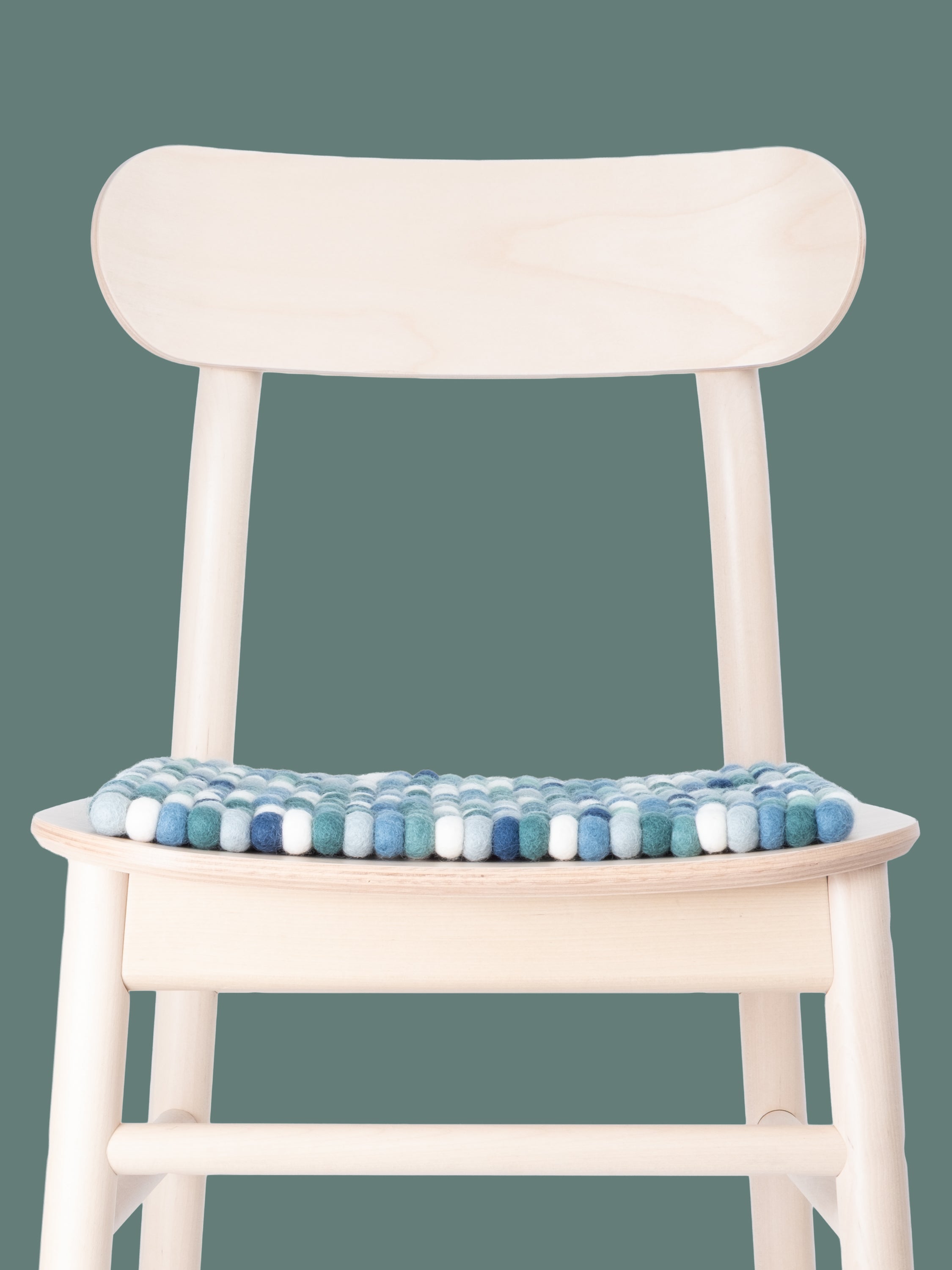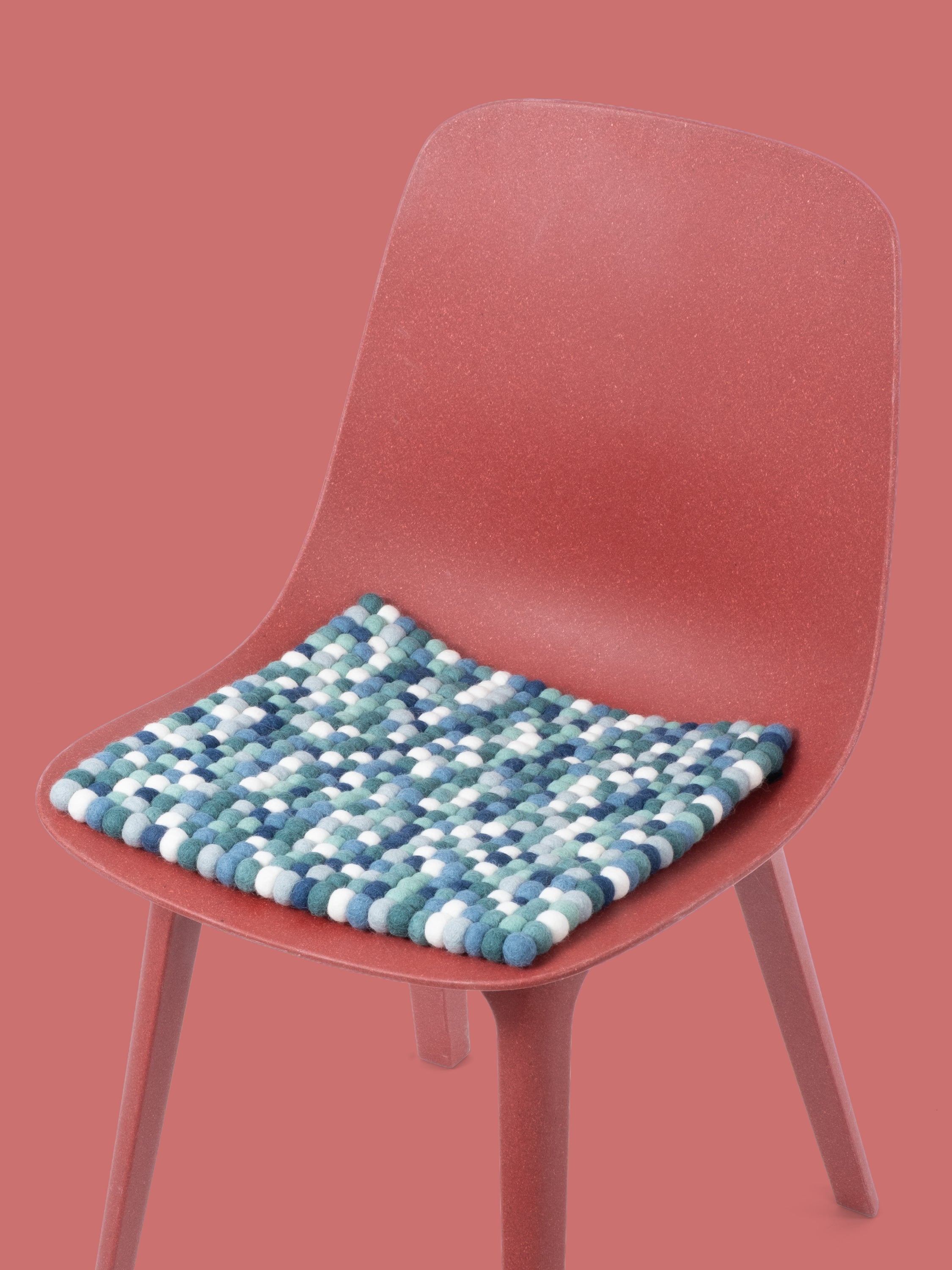 Die multifarbene Sitzauflage Mare bringt Wärme und Weichheit auf deinen Lieblingsstuhl. Gefertigt aus reiner Schurwolle, von Hand in Nepal hergestellt und unter fairen Bedingungen produziert. myfelt Sitzauflagen sind wasser- und schmutzabweisend und beidseitig verwendbar.