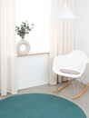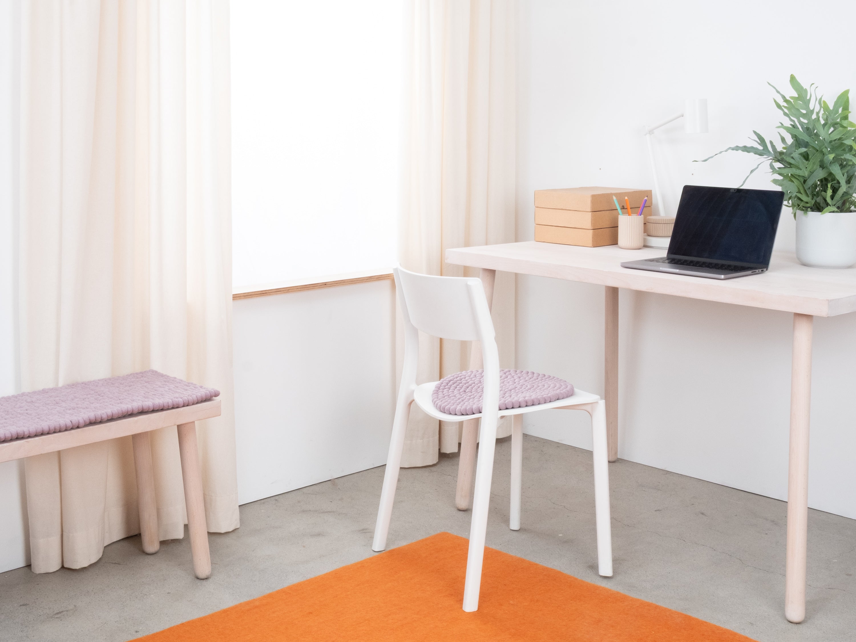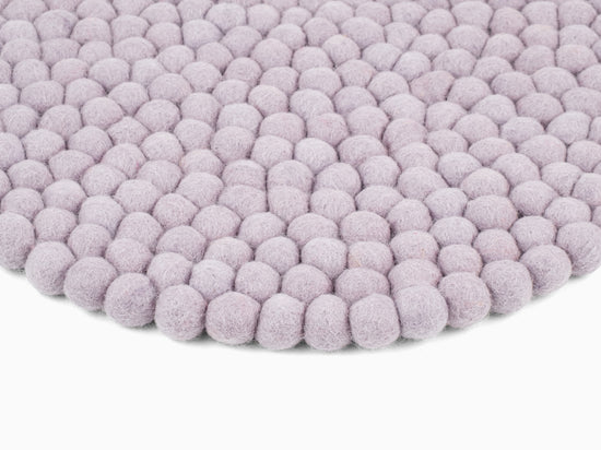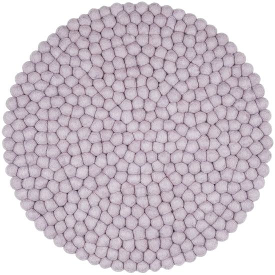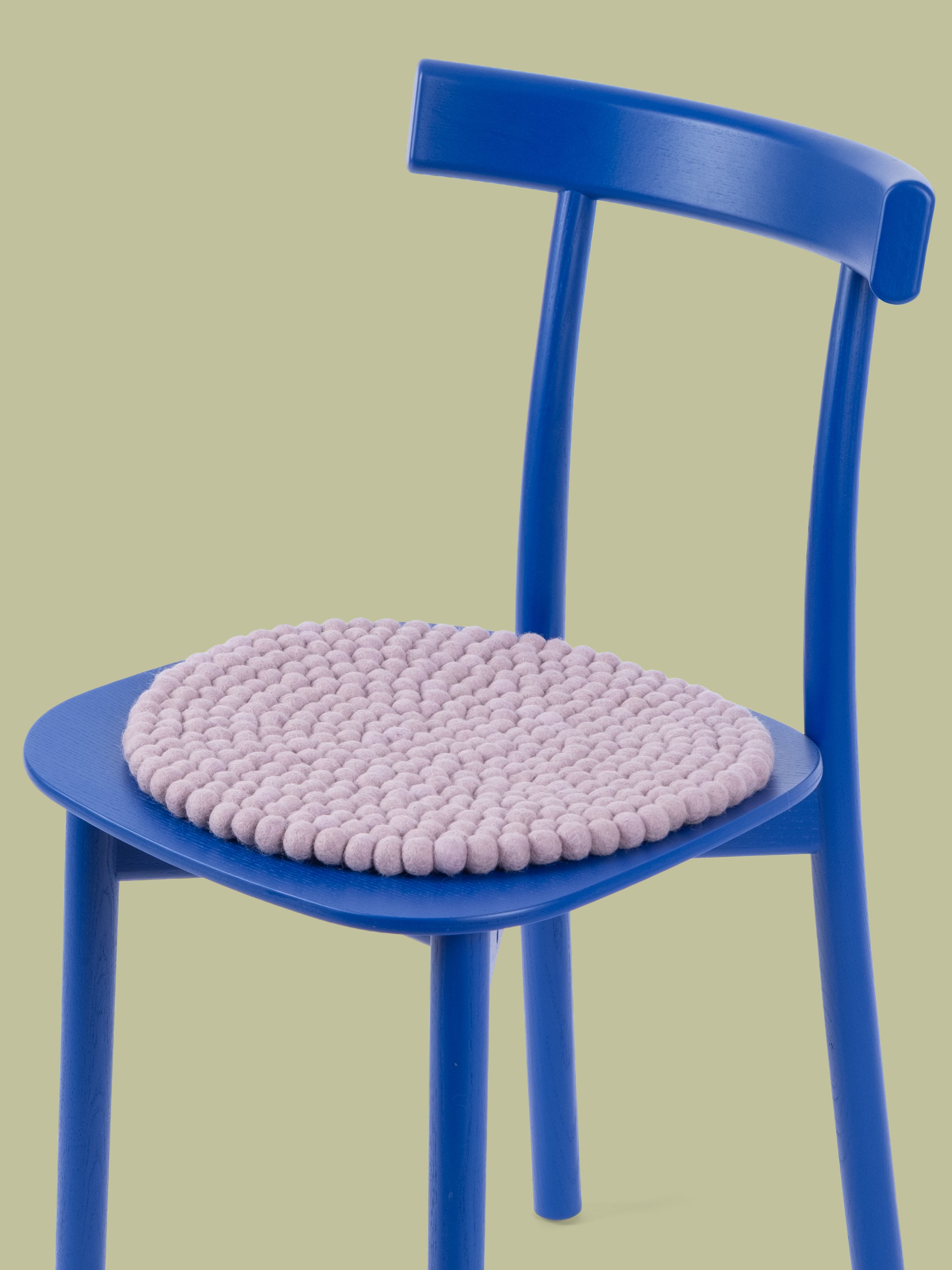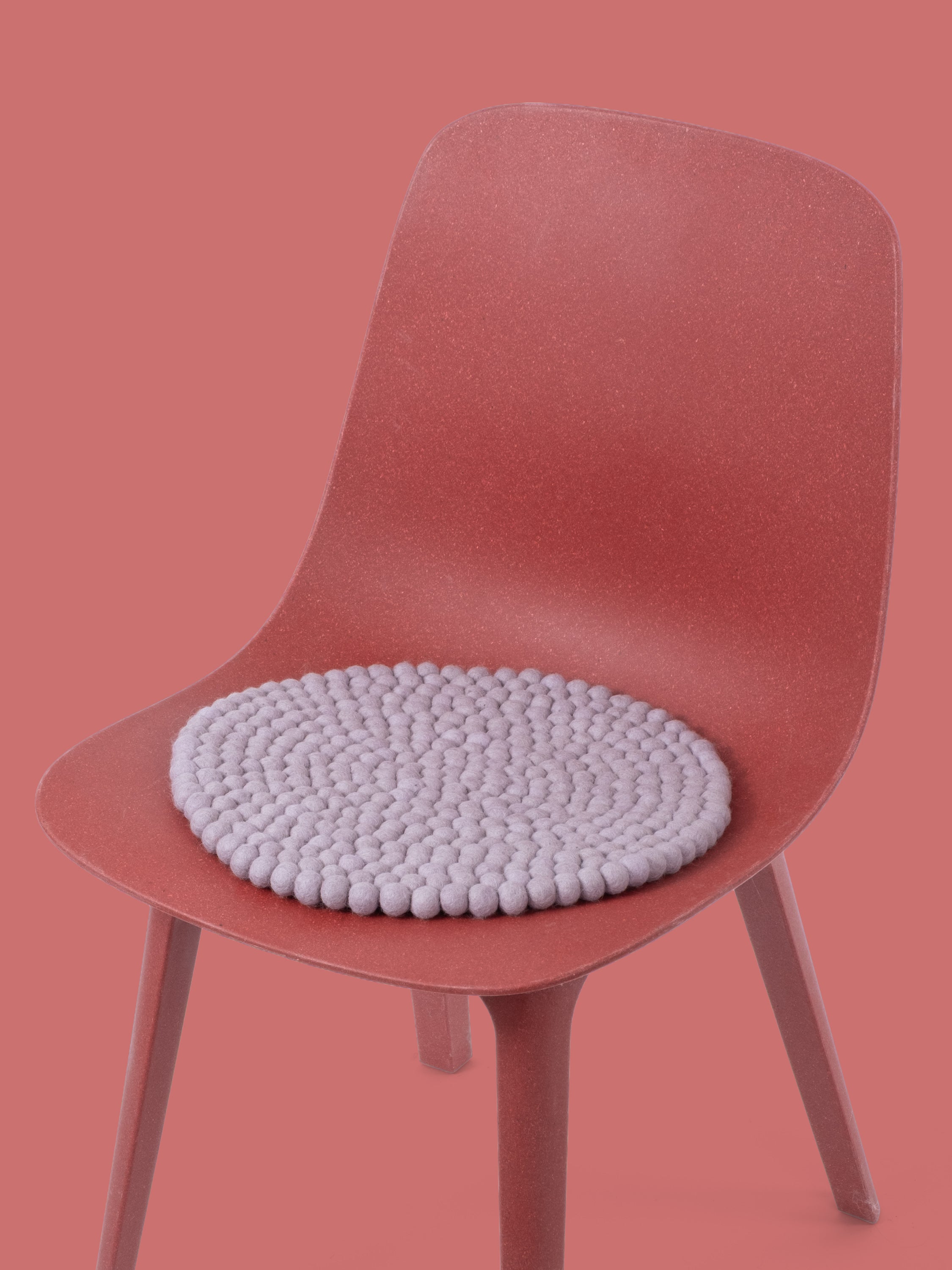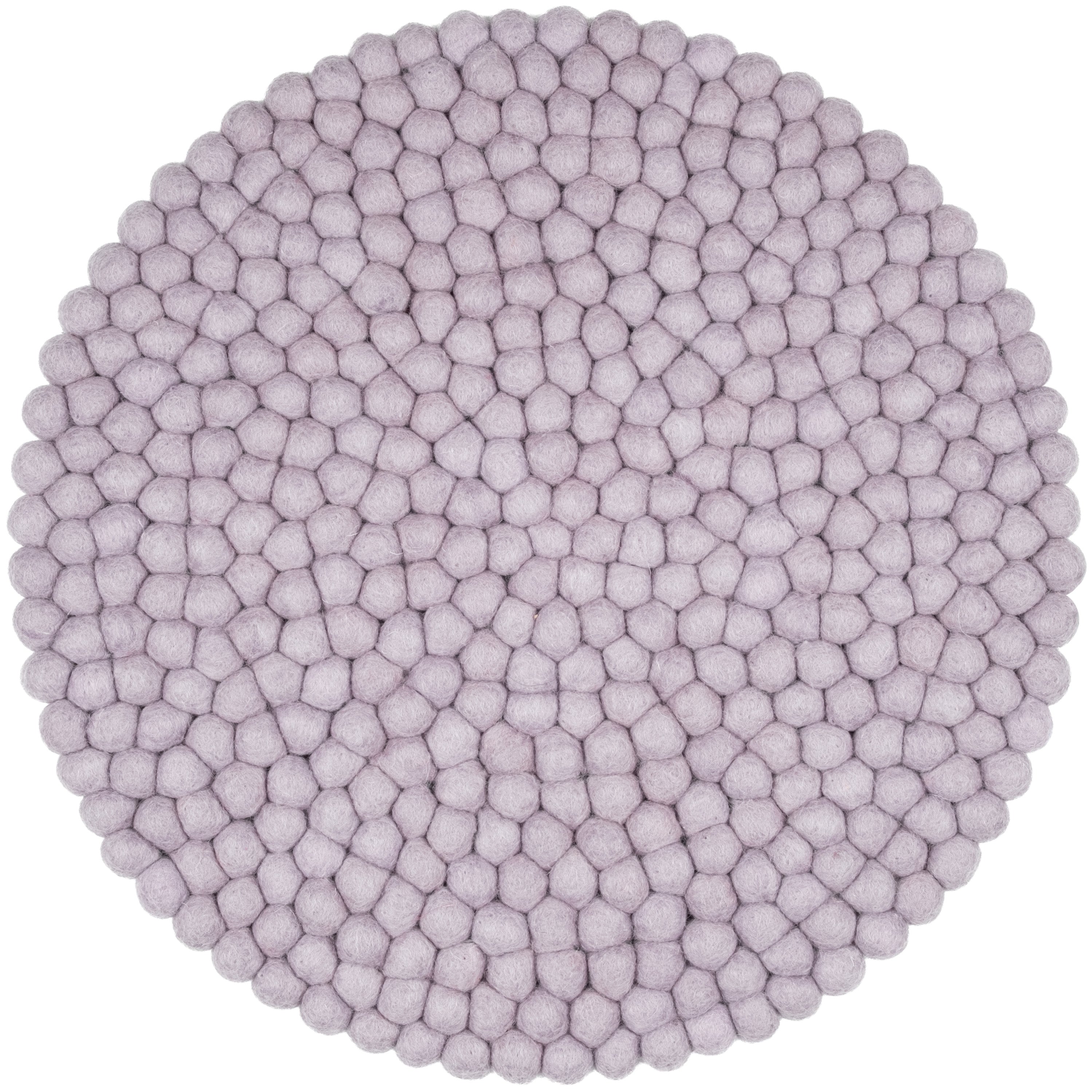 Runde, hellviolette Sitzauflage aus reiner Schurwolle.