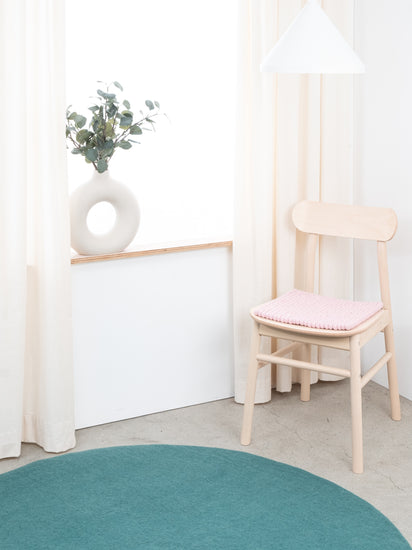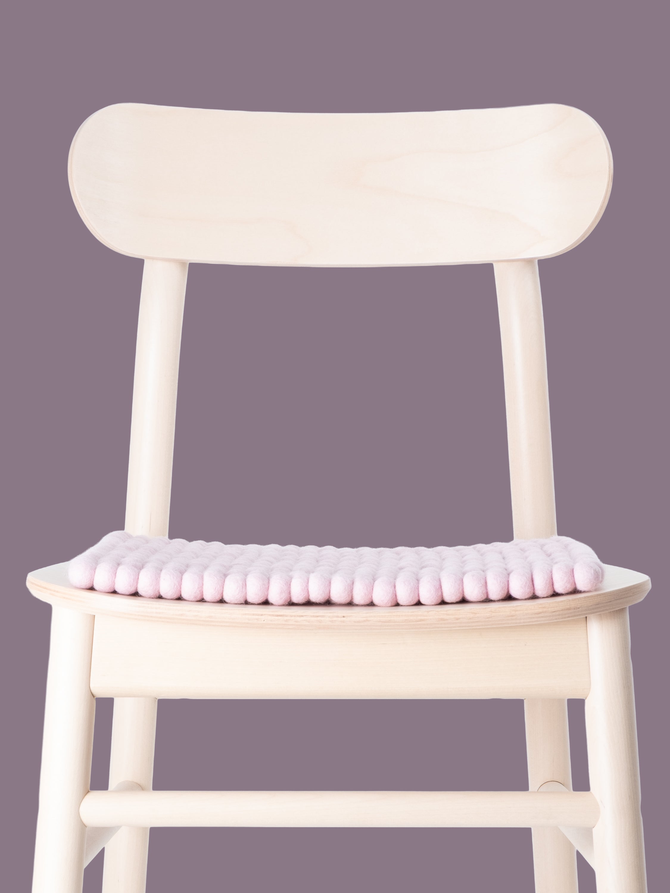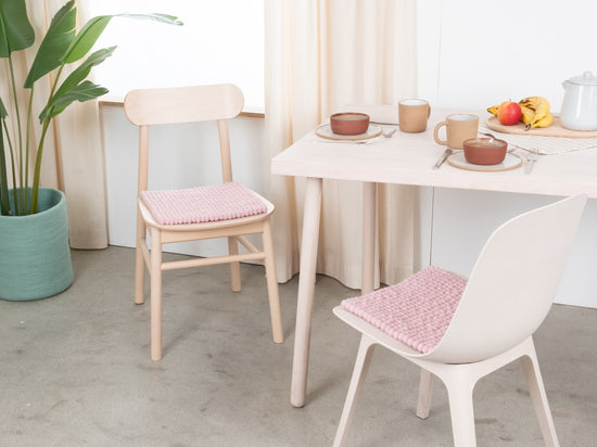 Die zartrosa Sitzauflage Mona bringt Wärme und Weichheit auf deinen Lieblingsstuhl. Gefertigt aus reiner Schurwolle, von Hand in Nepal hergestellt und unter fairen Bedingungen produziert. myfelt Sitzauflagen sind wasser- und schmutzabweisend und beidseitig verwendbar.