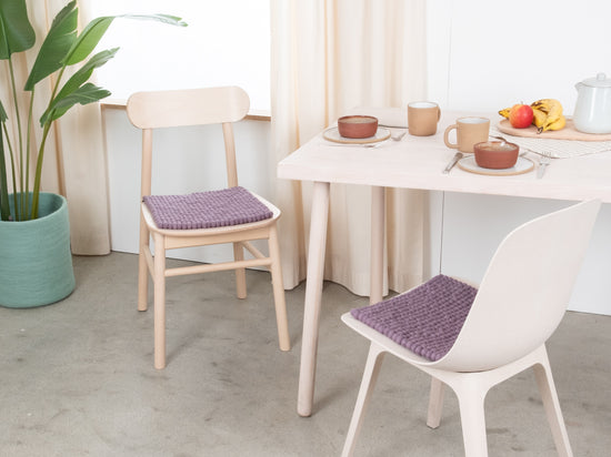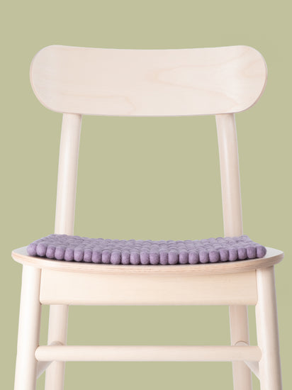 Die fliedergraue Sitzauflage Tove bringt Wärme und Weichheit auf deinen Lieblingsstuhl. Gefertigt aus reiner Schurwolle, von Hand in Nepal hergestellt und unter fairen Bedingungen produziert. myfelt Sitzauflagen sind wasser- und schmutzabweisend und beidseitig verwendbar.