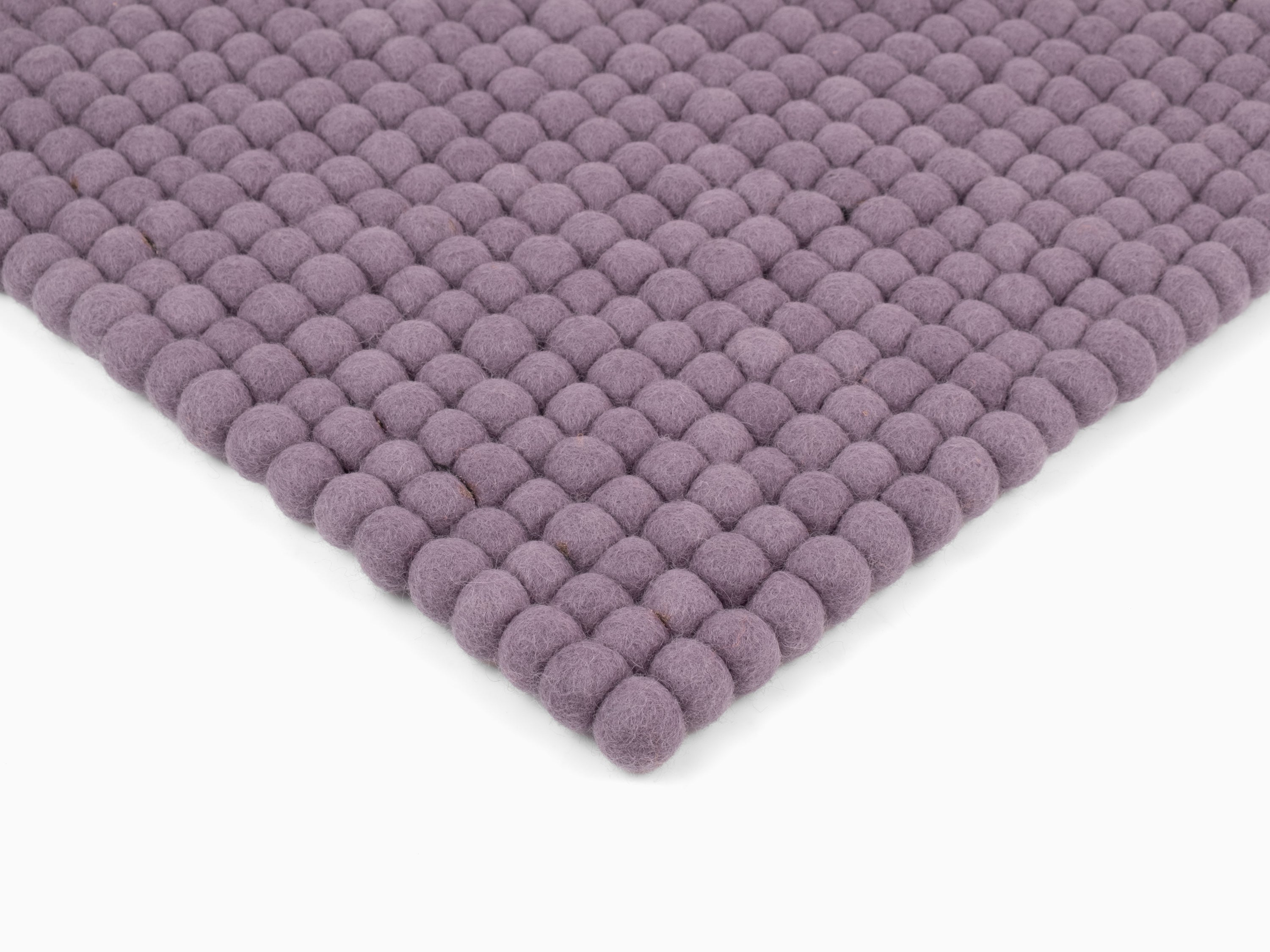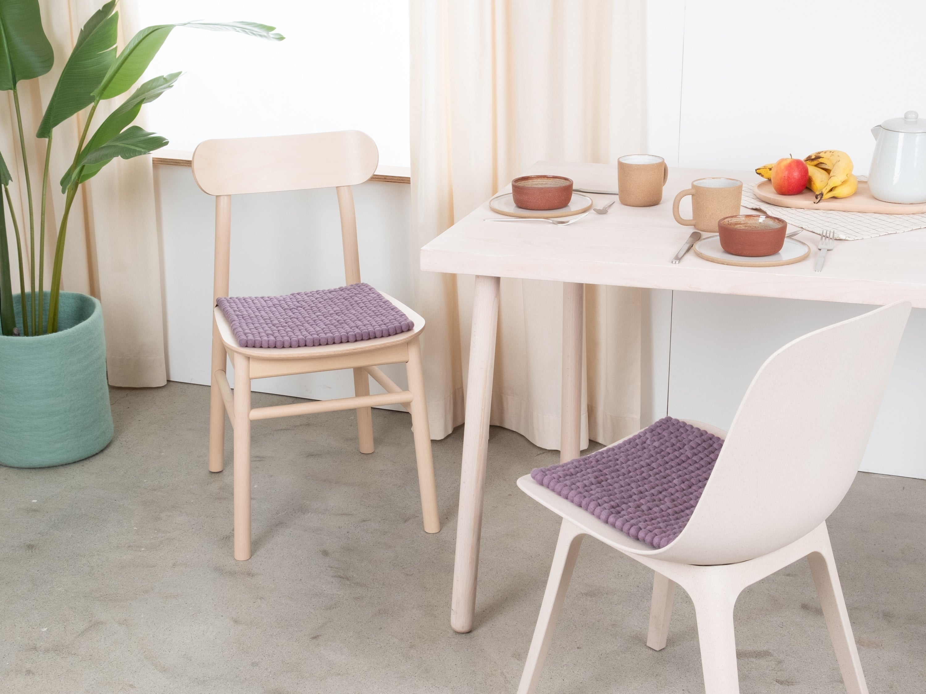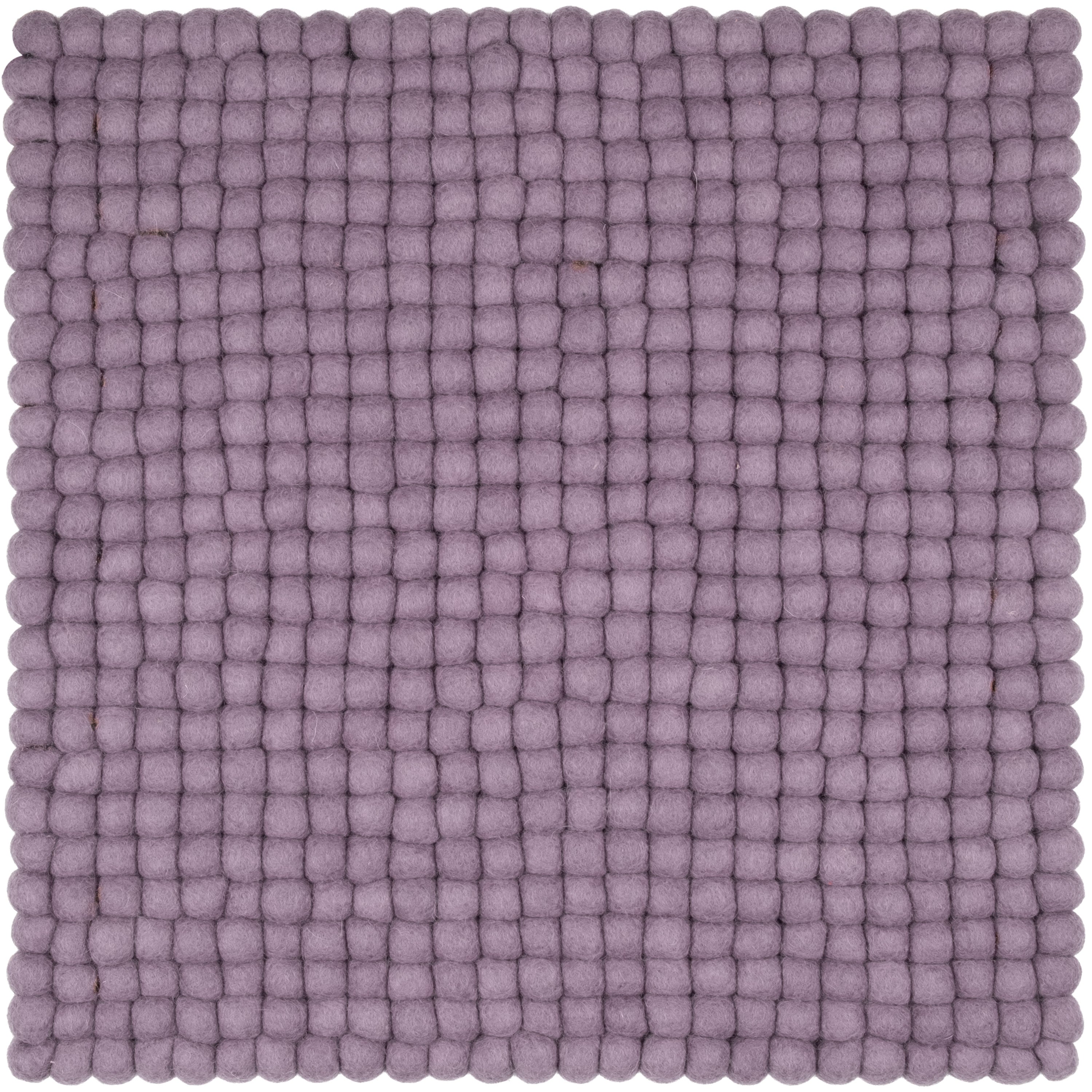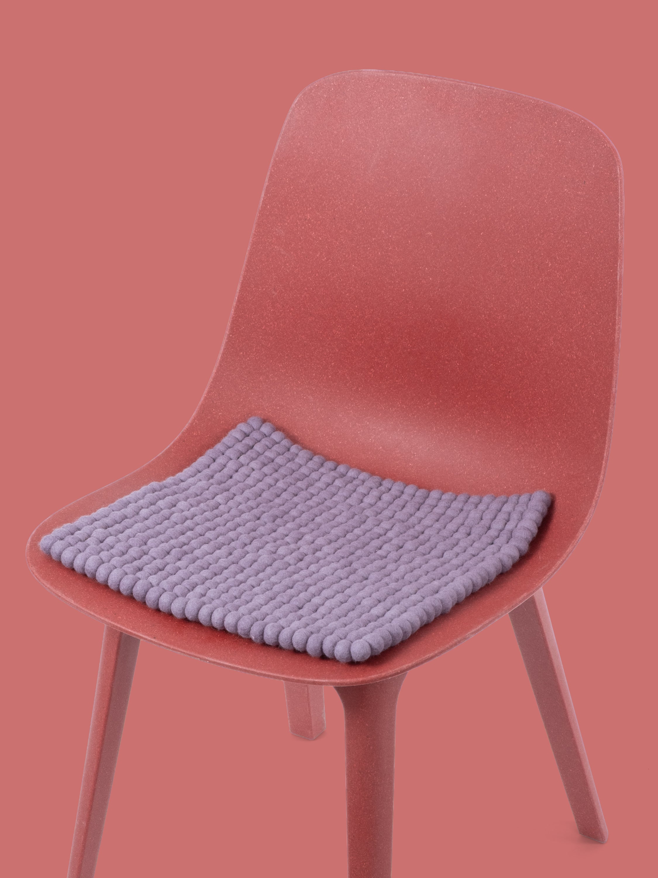Quadratische, fliedergraue Sitzauflage aus reiner Schurwolle.