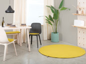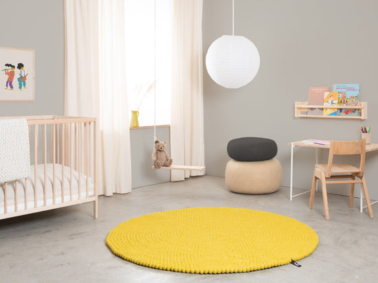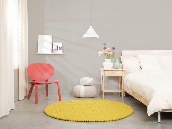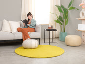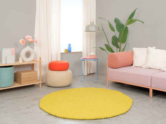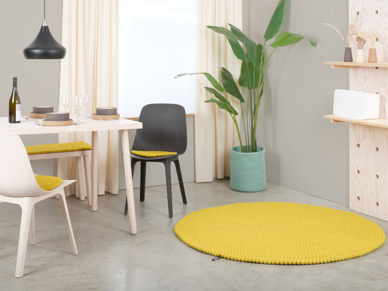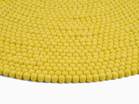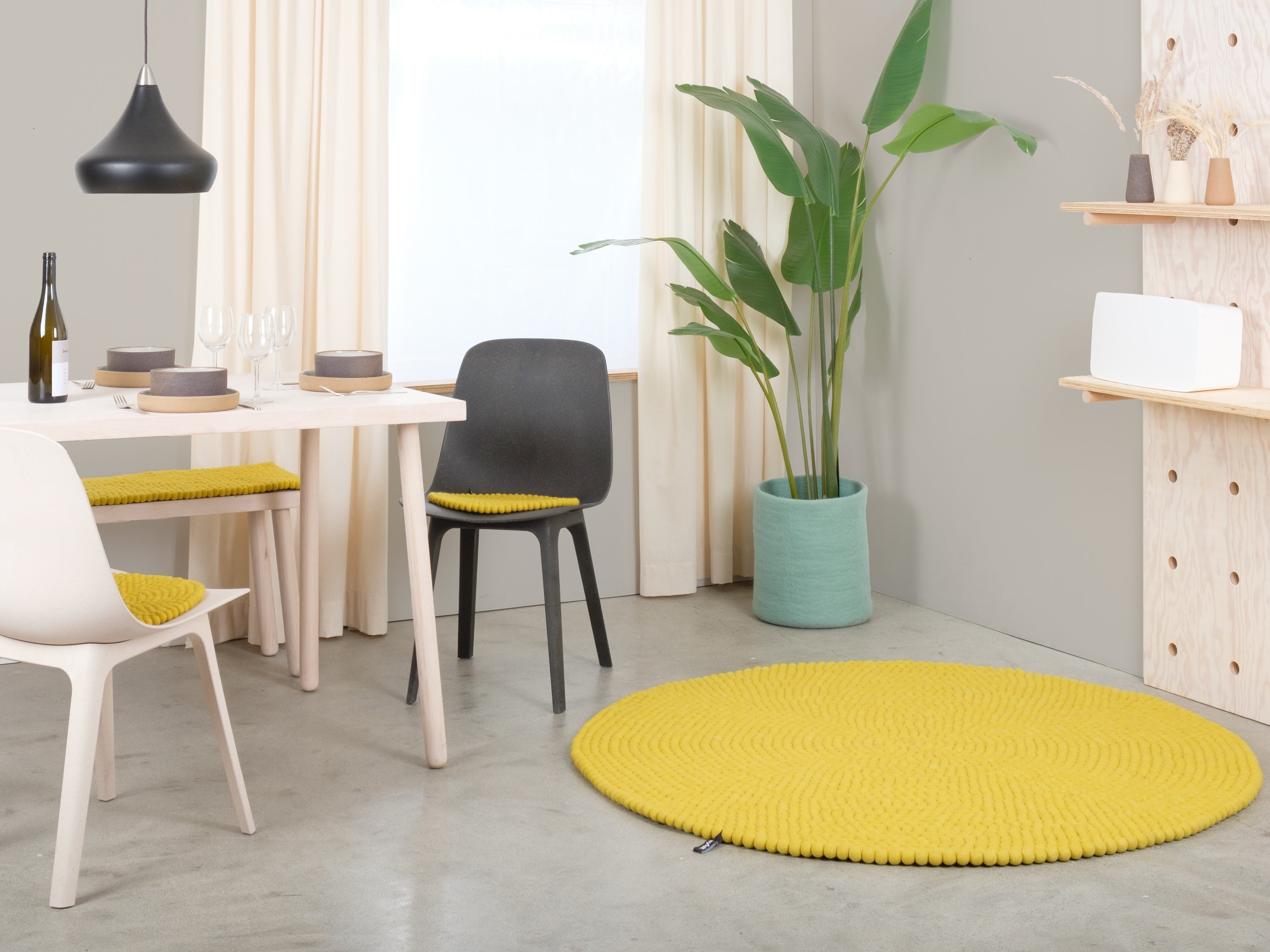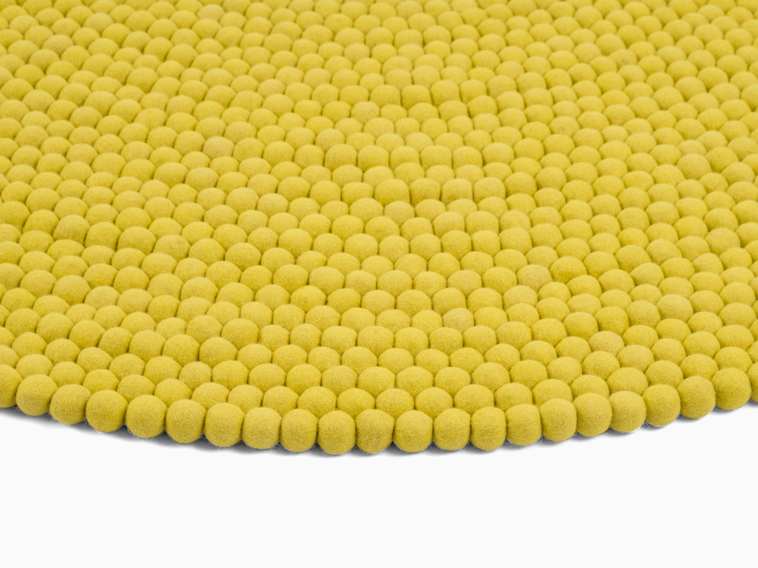 Kata is een vilten bolletjeskleed in fris geelgroen. Stralend, vitaal en vol energie brengt het beweging in de ruimte – vrolijk accent in de woonkamer of lichtpunt op de werkplek. Zorgt voor levendigheid en lichtheid. Zacht, robuust en gemakkelijk te onderhouden. Handgemaakt in Nepal van 100 % scheerwol.