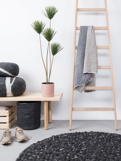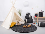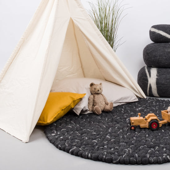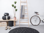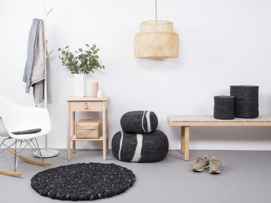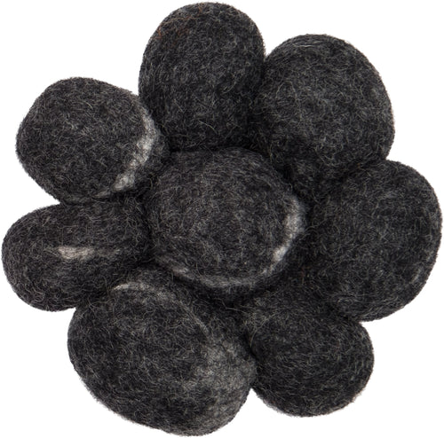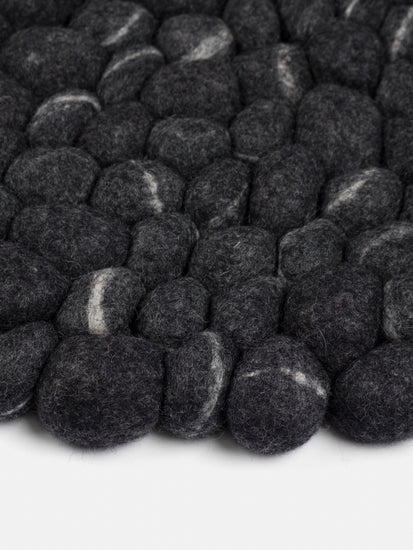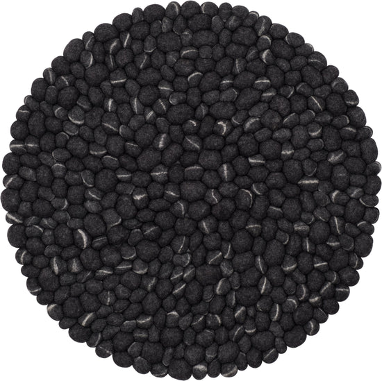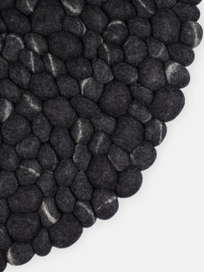 Rond, antracietkleurig Vilten boltapijt van zuivere scheerwol.