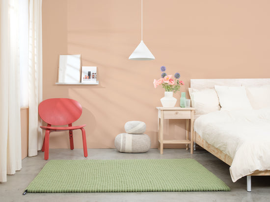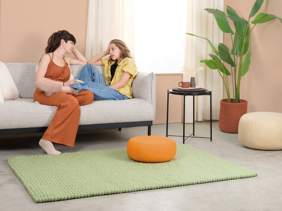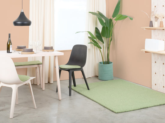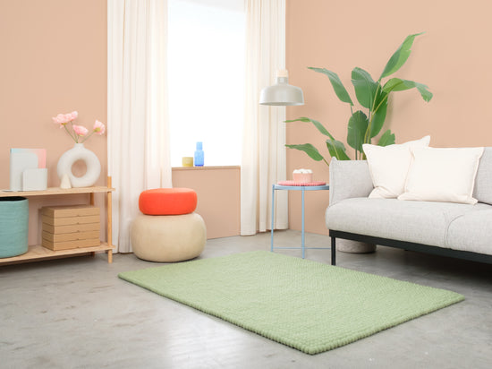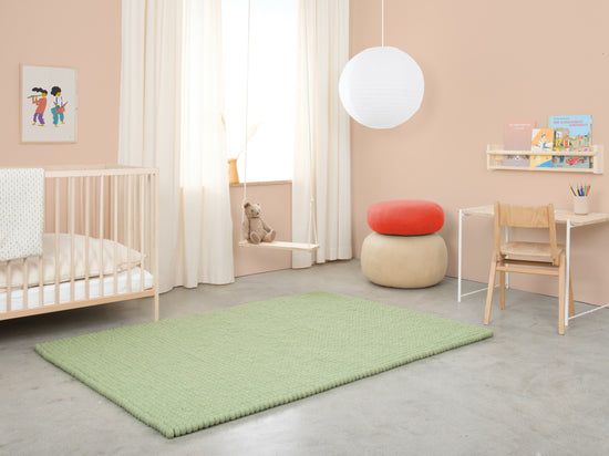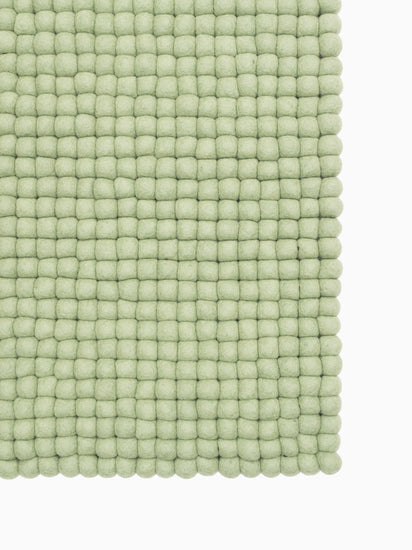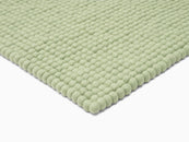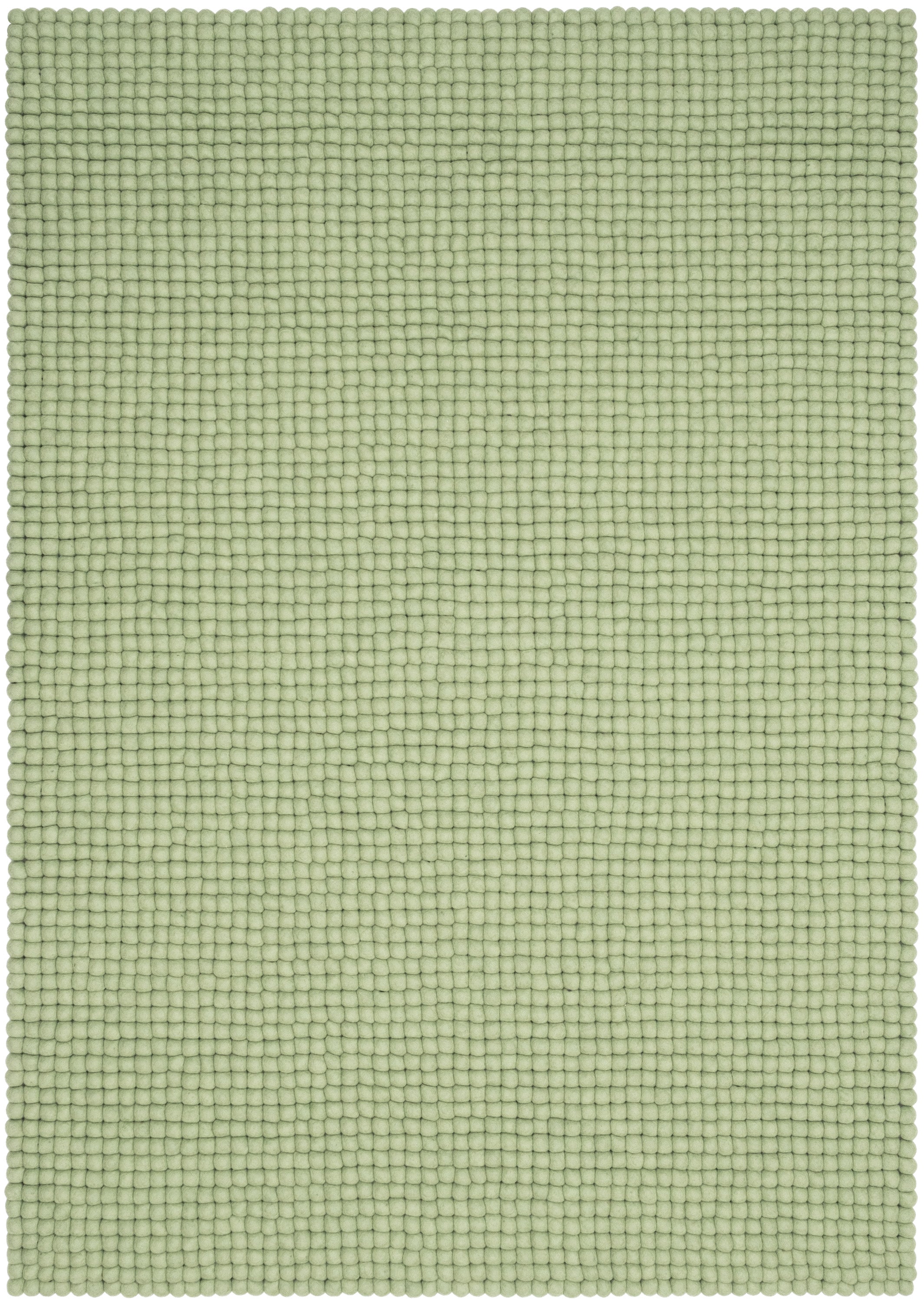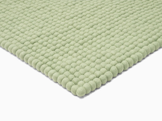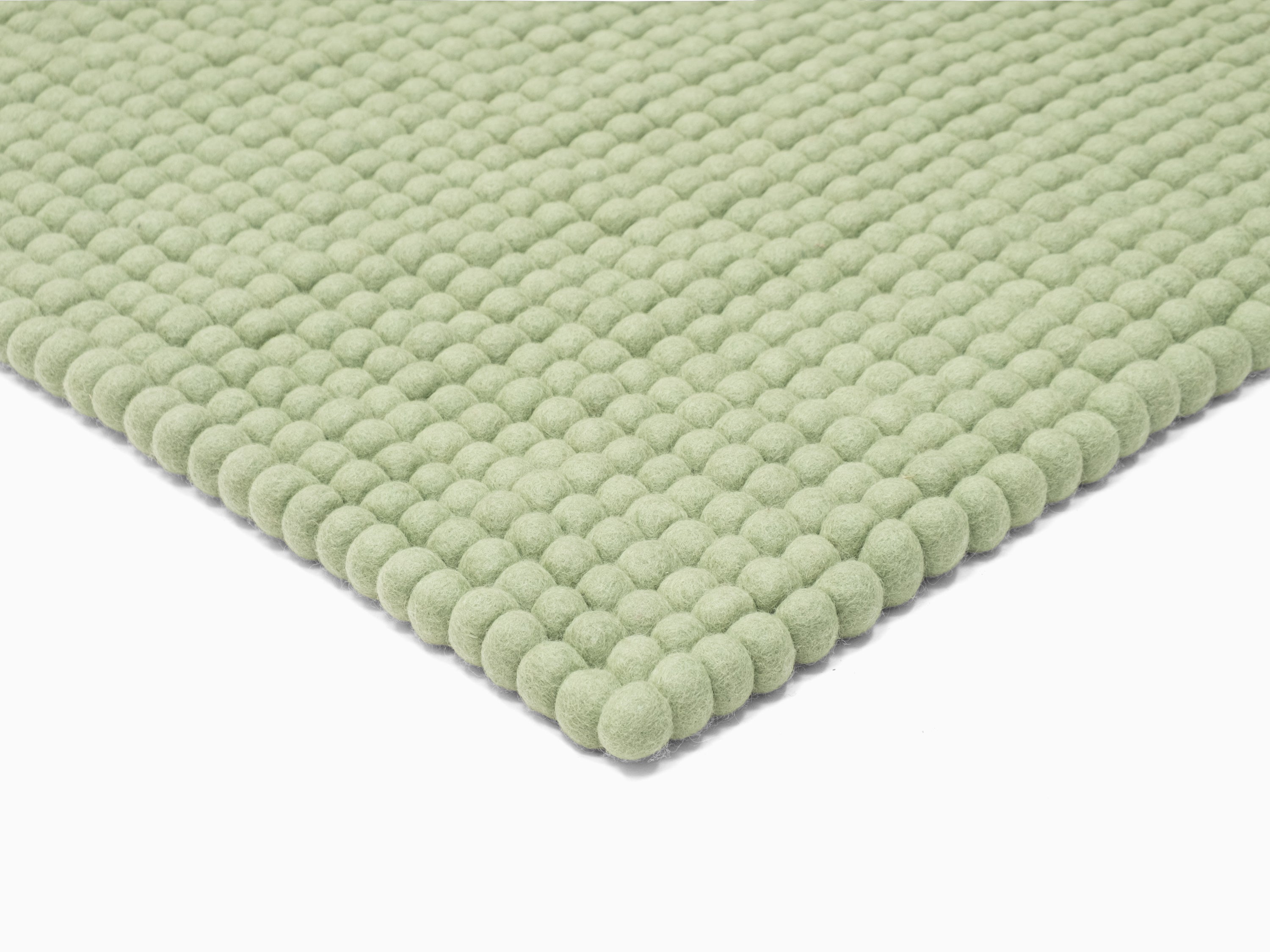 Lasse is een vilten bolletjeskleed in zacht saliegroen. Brengt rust en lichtheid in de ruimte en combineert mooi met hout, wit en natuurtinten. Zacht aan de voeten, dagelijks robuust en van nature vuilafstotend. Handgemaakt in Nepal van 100 % scheerwol.
