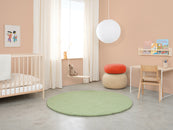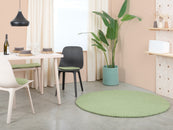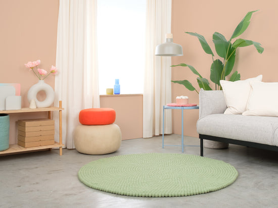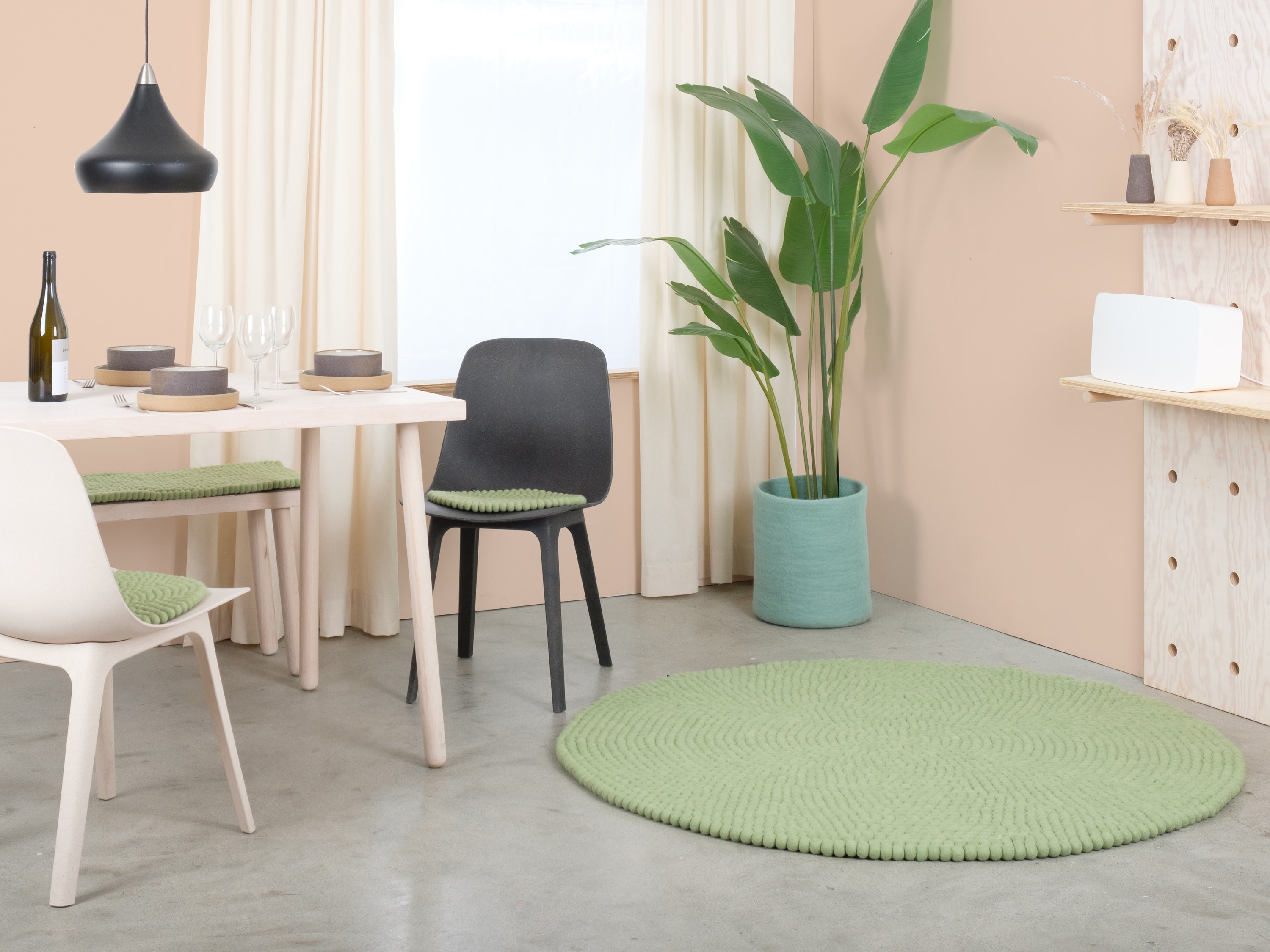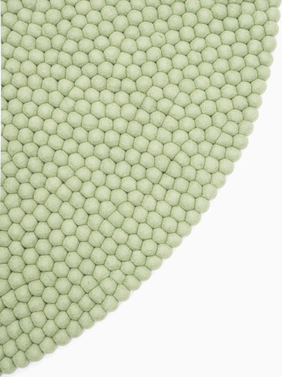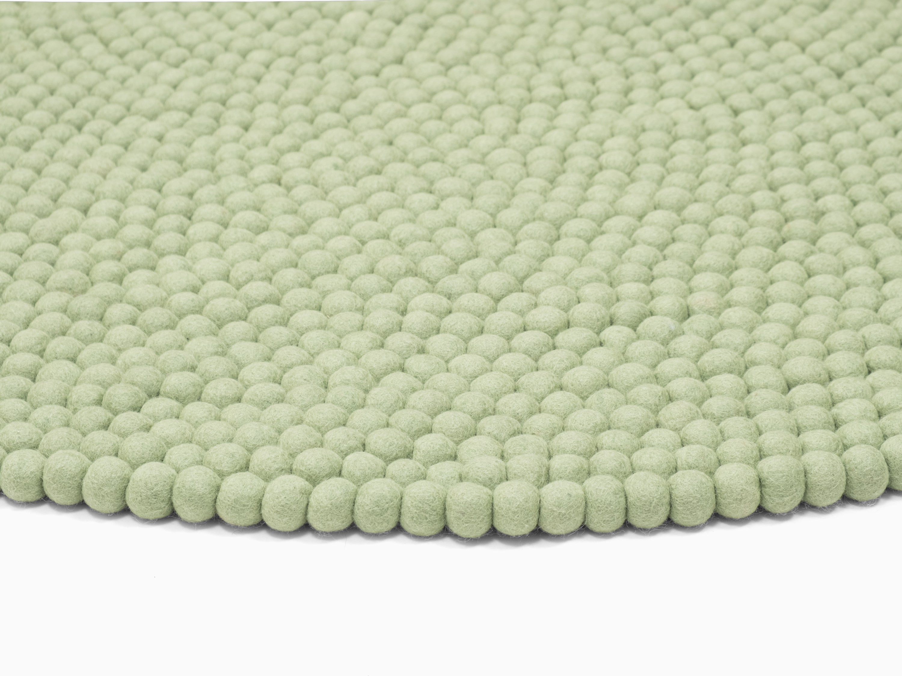 Lasse is een vilten bolletjeskleed in zacht saliegroen. Brengt rust en lichtheid in de ruimte en combineert mooi met hout, wit en natuurtinten. Zacht aan de voeten, dagelijks robuust en van nature vuilafstotend. Handgemaakt in Nepal van 100 % scheerwol.