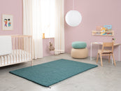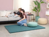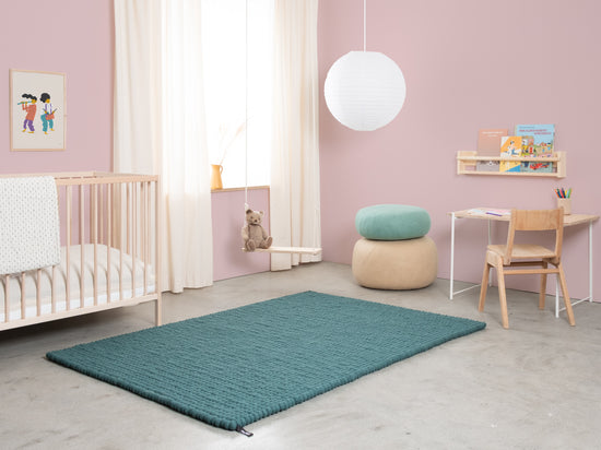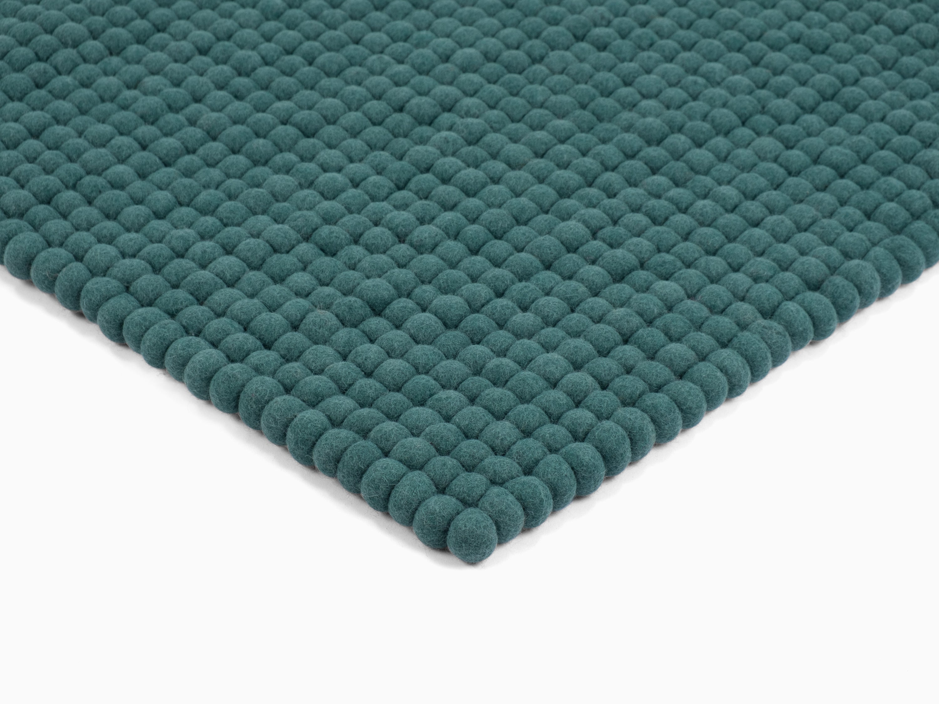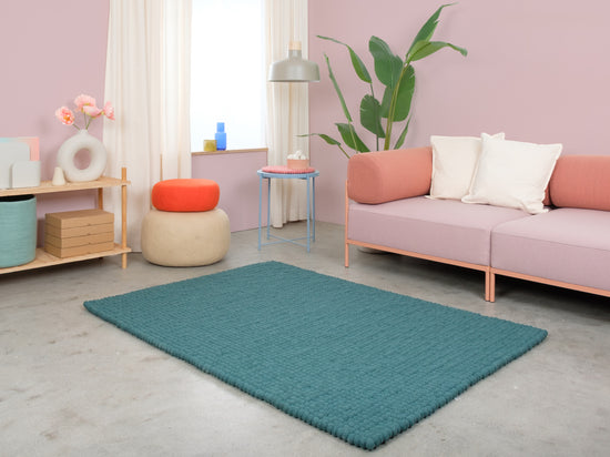 Noah is een vilten bolletjeskleed in diep petrol. Krachtig, helder en toch ontspannend – als statement of rustige basis. Past bij licht hout, beton en neutrale kleuren. Merkbaar zacht, duurzaam en onderhoudsvriendelijk. Handgemaakt in Nepal van 100 % scheerwol.
