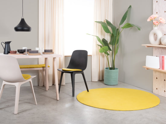 Kata is een vilten vloerkleed in fris geelgroen. Stralend, vitaal en vol energie brengt het beweging in de ruimte – vrolijk accent in de woonkamer of lichtpunt op de werkplek. Zorgt voor levendigheid en lichtheid. Zacht, robuust en gemakkelijk te onderhouden. Handgemaakt in Nepal van 100 % scheerwol.
