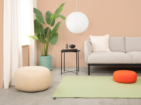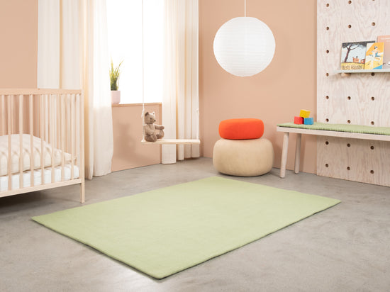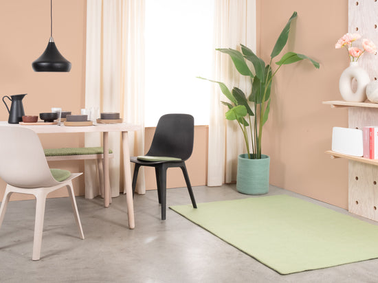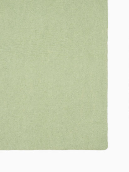 Lasse is een vilten tapijt in zacht saliegroen. Het brengt rust en lichtheid in de kamer en harmonieert met hout, wit en natuurlijke tinten. Zacht onder de voeten, robuust in dagelijks gebruik en van nature vuilafstotend. Handgemaakt in Nepal van 100% pure scheerwol.
