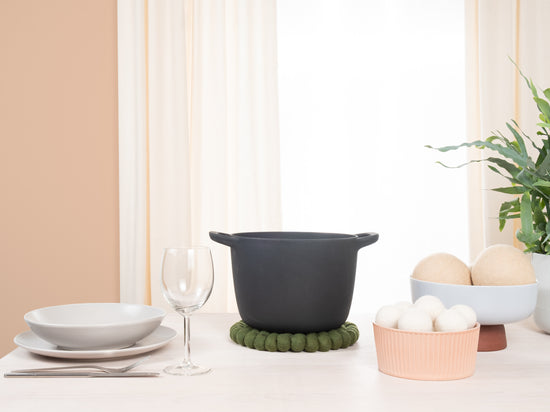 De onderzetter Jost in de kleur donkergroen combineert functionaliteit met een charmante uitstraling. Robuust, hittebestendig, water- en vuilafstotend en aan beide zijden te gebruiken. Gemaakt van pure scheerwol, met de hand vervaardigd in Nepal onder eerlijke omstandigheden.