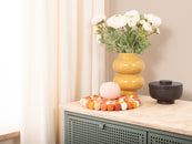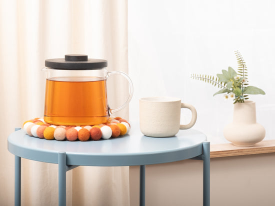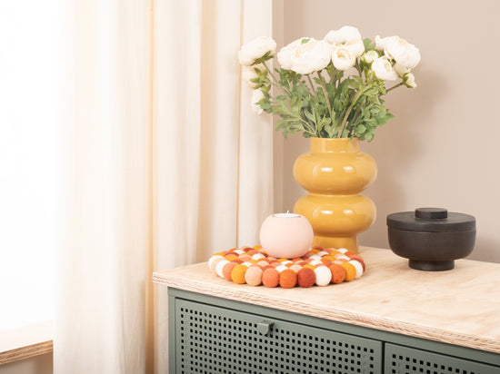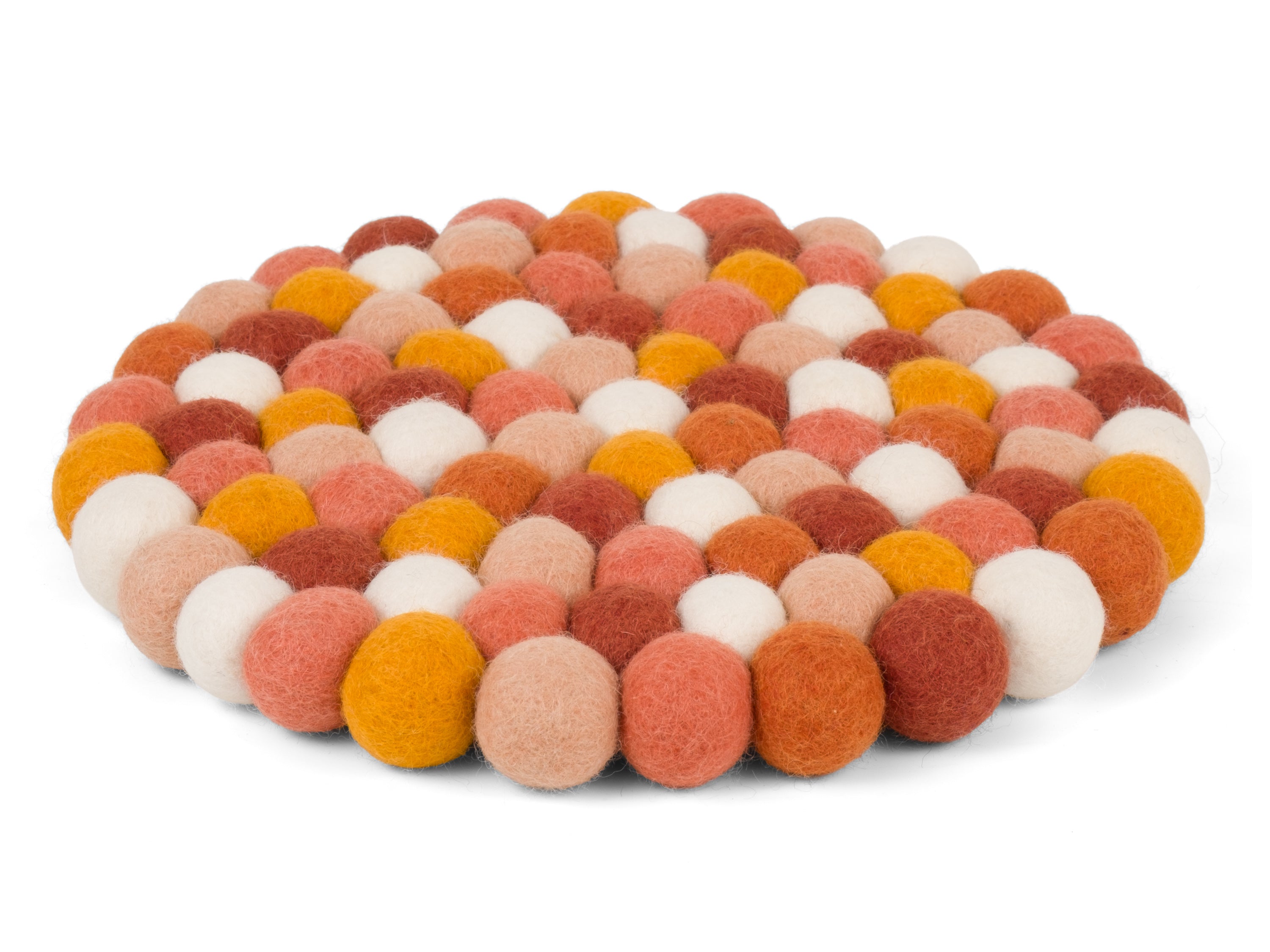 De onderzetter Juna in de kleuren rood, oranje en wit combineert functionaliteit met een charmante uitstraling. Robuust, hittebestendig, water- en vuilafstotend en aan beide zijden te gebruiken. Gemaakt van pure scheerwol, met de hand vervaardigd in Nepal en geproduceerd onder eerlijke omstandigheden.