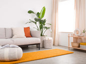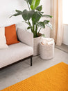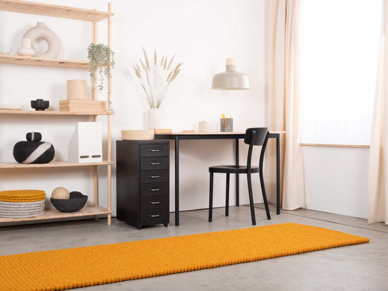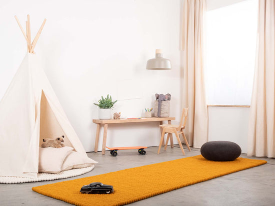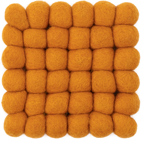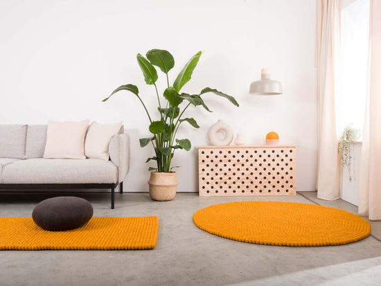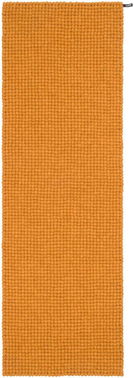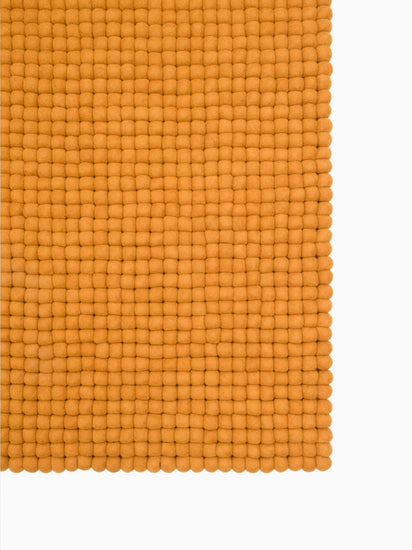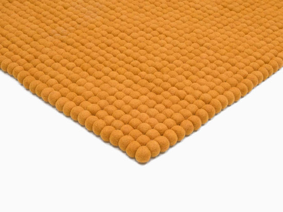 Rechthoekig okergeel viltenbollen-tapijt van zuivere scheerwol.
