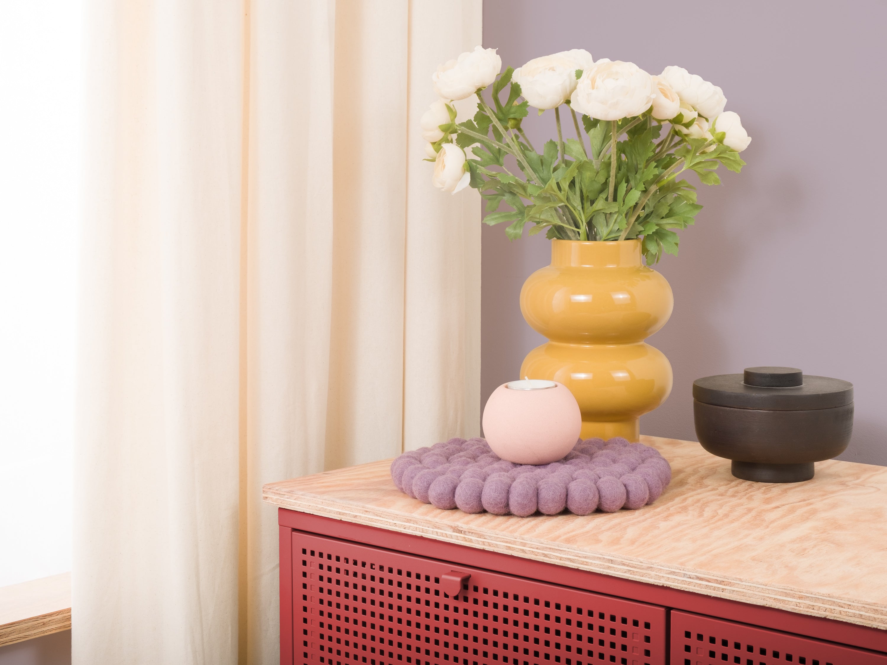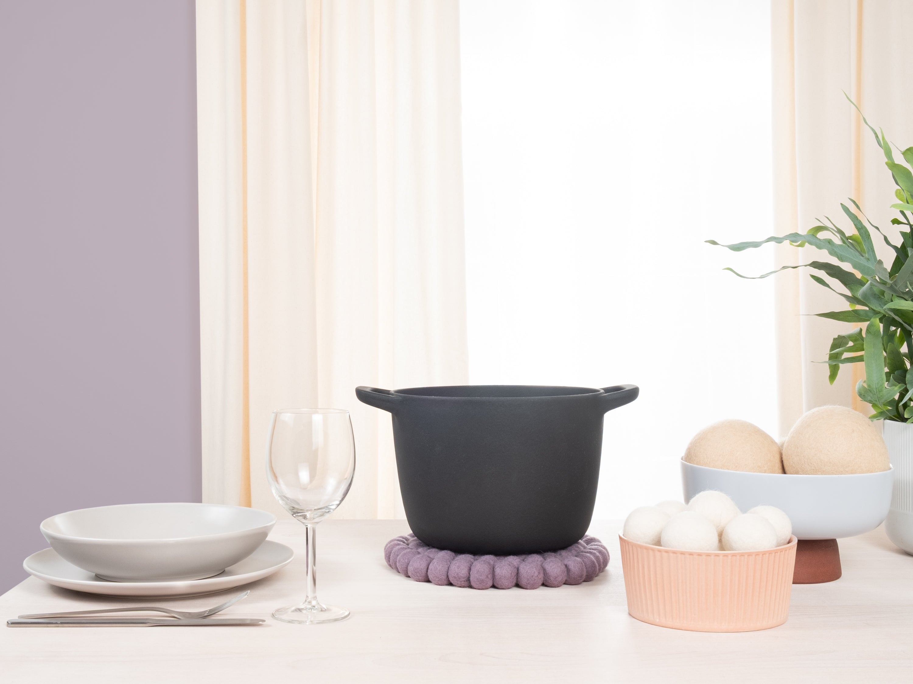 De onderzetter Tove in de kleur lila-grijs combineert functionaliteit met een charmante uitstraling. Robuust, hittebestendig, water- en vuilafstotend en aan beide zijden te gebruiken. Gemaakt van pure scheerwol, met de hand vervaardigd in Nepal onder eerlijke omstandigheden.